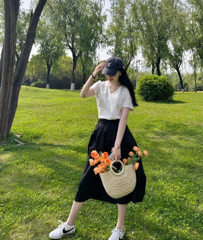 無論在什麼時候,黑白配都是不會出錯的顏色組合,經典的白色t恤,小v領的設計,穿起來可以把脖子線條拉得很修長,肩寬的身材穿還能起到弱化缺點的效果。選擇一條黑色半身傘裙,簡單又不挑人,畢竟適合懶人姐妹穿的一套。