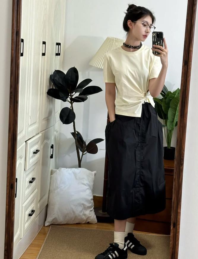 比起常規款t恤,我個人更喜歡這種不規則的短袖t恤,下襬處的皺褶設計,還是蠻個性的,與黑色半身傘裙相配,實在是太顯瘦了,梨形身材的姐妹可以放心穿哦。腳下踩着的黑色運動鞋,和裙子顏色進行了呼應,讓整個配色更有協調性了。