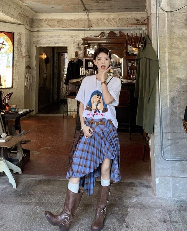 還有,t恤和牛仔半裙的搭配也非常實用,不管是在什麼場合裏,都能讓你展現出時髦的狀態,喜歡休閒一些風格的女生,t恤的版型可以選擇寬鬆點,這樣更藏肉顯瘦。或者你搭配一雙運動鞋,這樣也很顯青春活力。