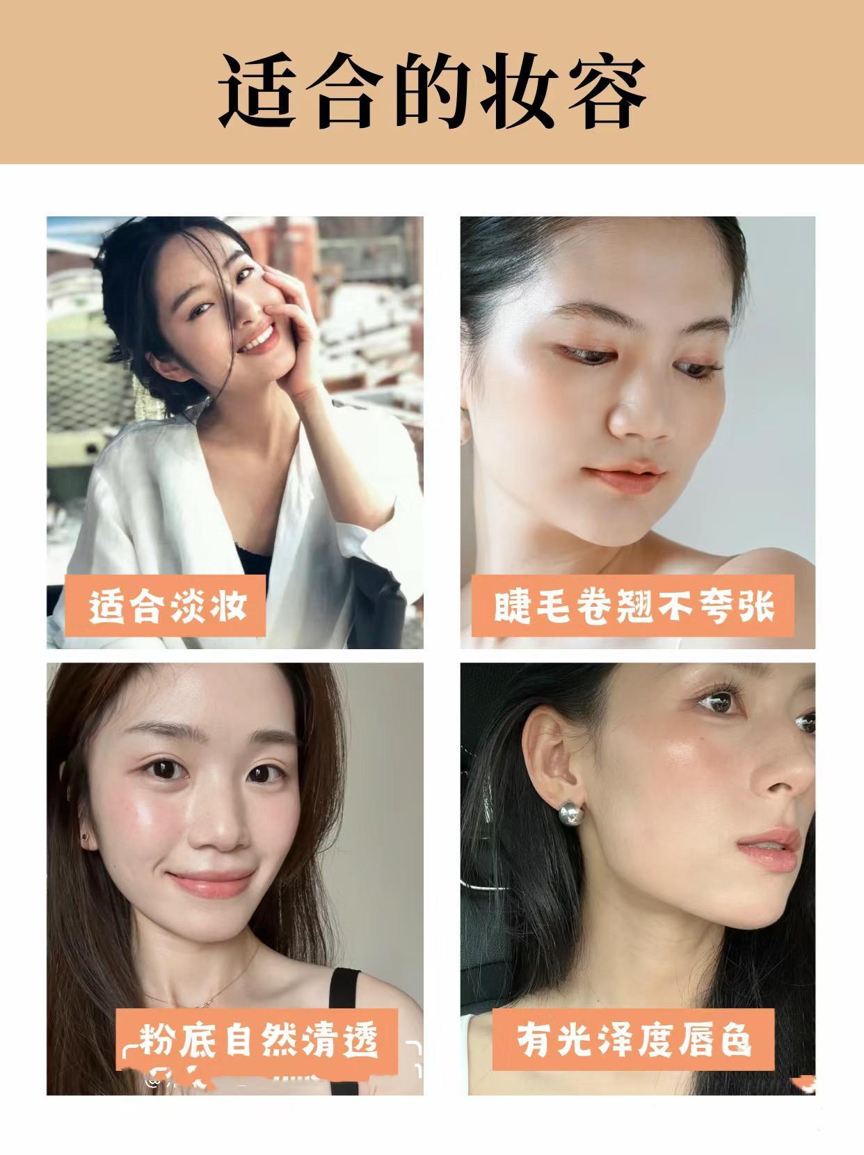 首先睫毛可以稍微卷翹但不能誇張,眼影也不需要太誇張。粉底選擇自然清透的色號就可以,配上有光澤度但不鮮豔的純色,提氣色又不浮誇。