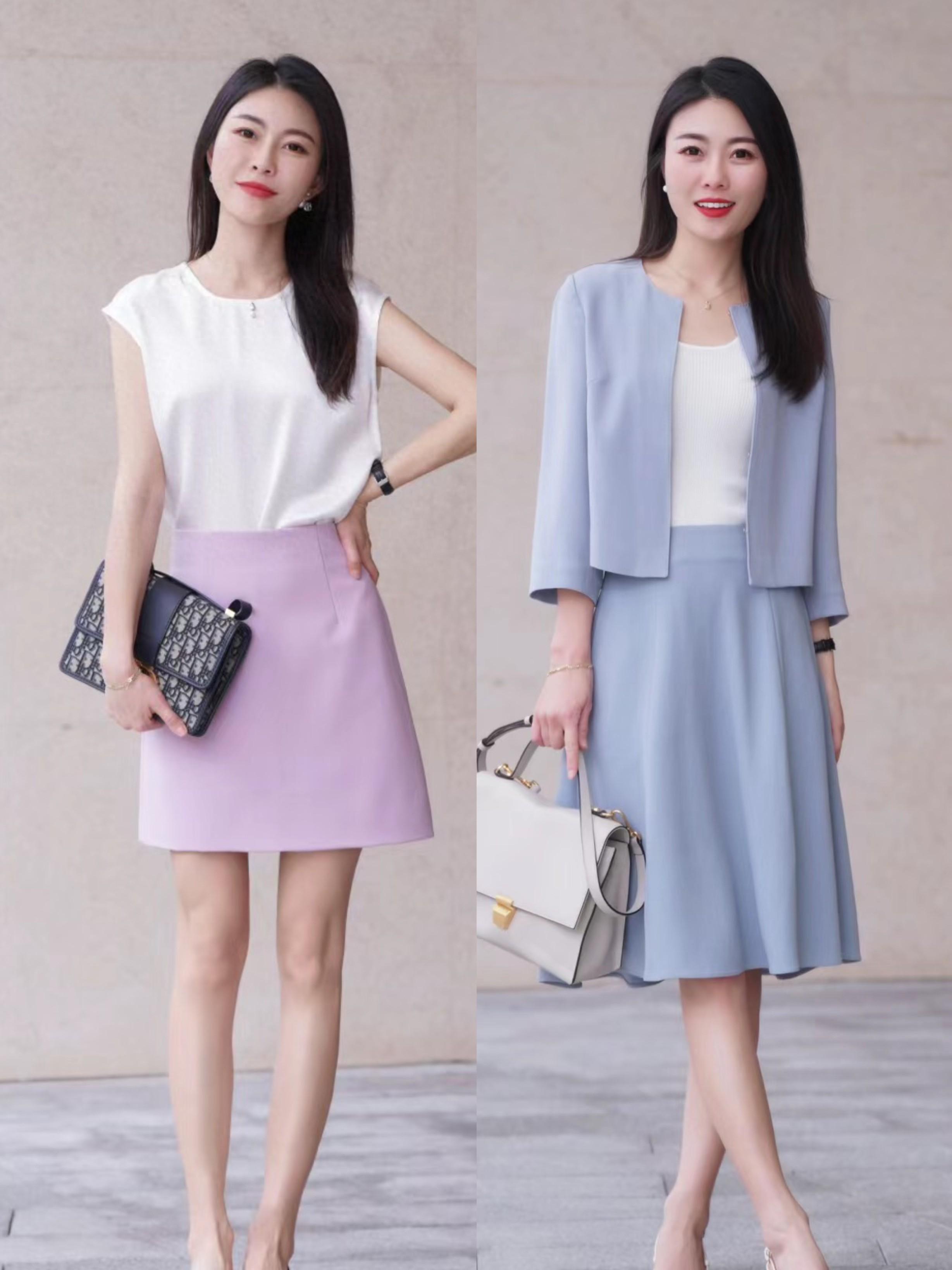 淺藍色的套裙,配上白色小背心,更加的清爽明亮。白色小背心作爲內搭,可以收攏胸部線條,視覺上也更加顯瘦一些。
