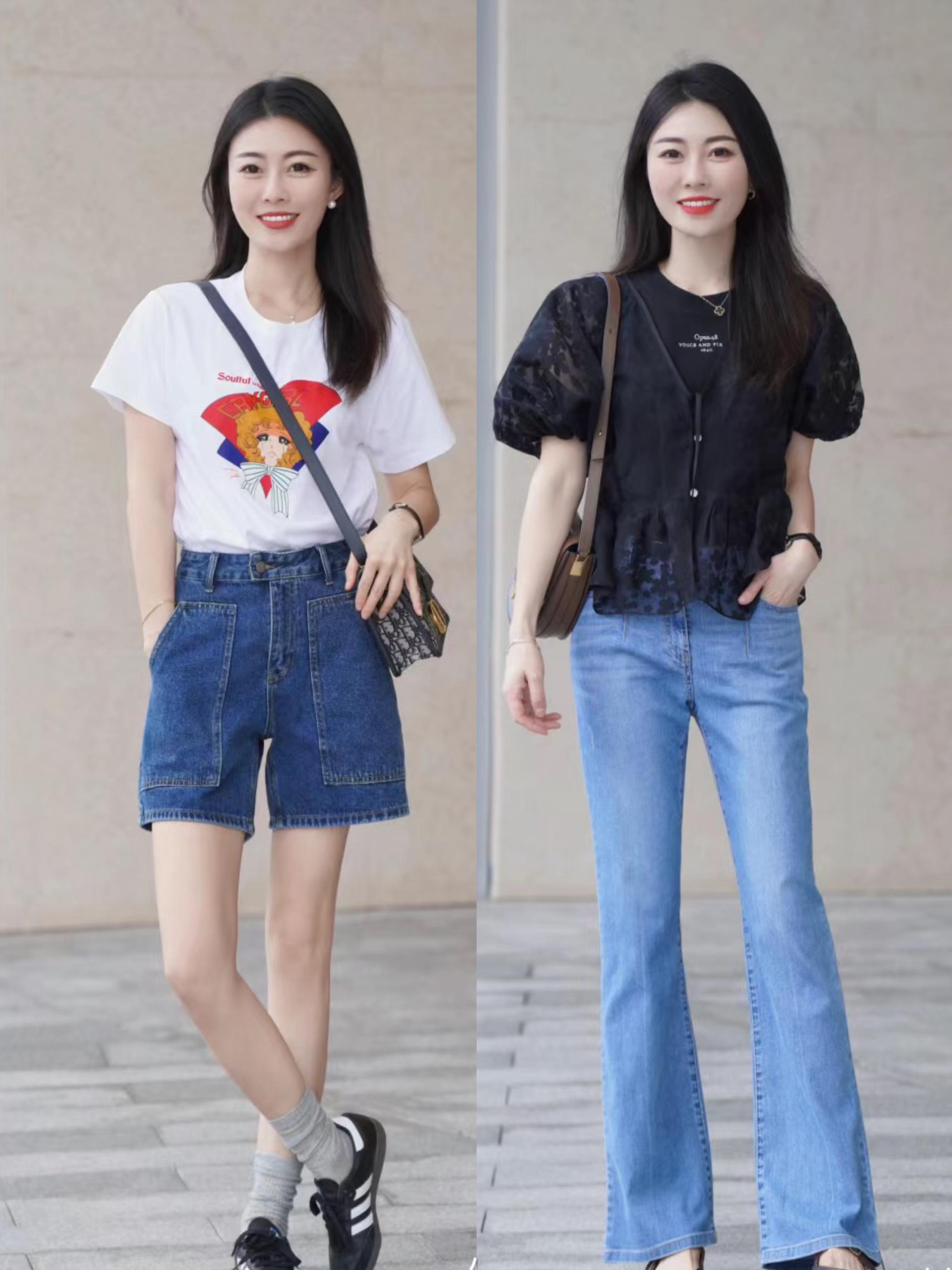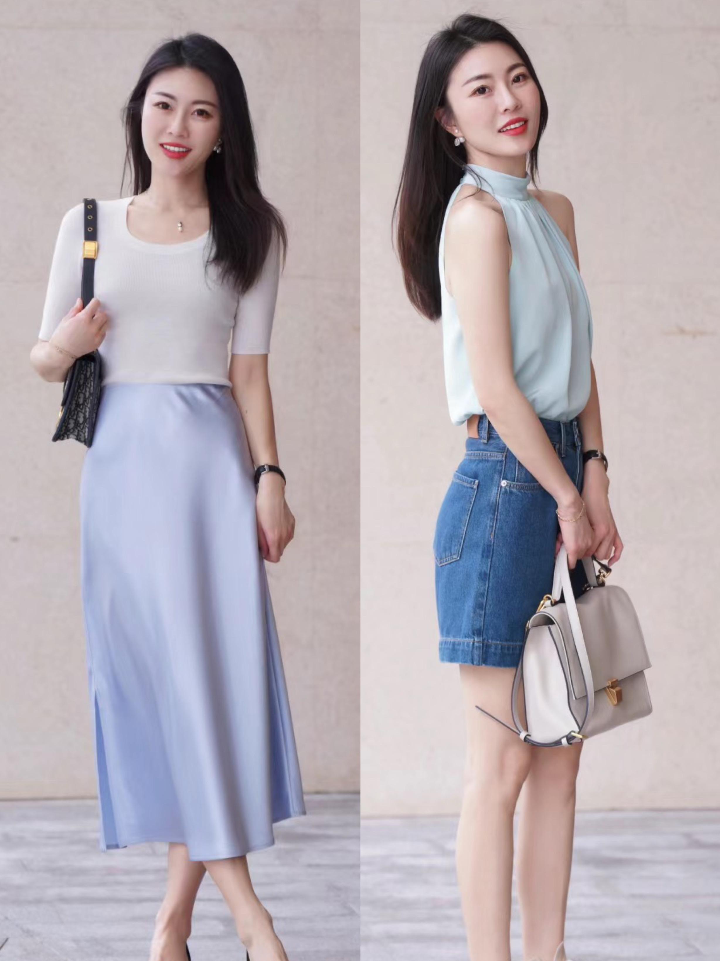 建議大家多嘗試修身剪裁的服裝,比如修身的T恤、或者收腰的半身裙、短褲等單品,適當但不浮誇的修身設計,更容易駕馭。比如修身T恤配醋酸半身裙、優雅不邋遢。
