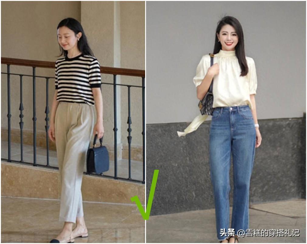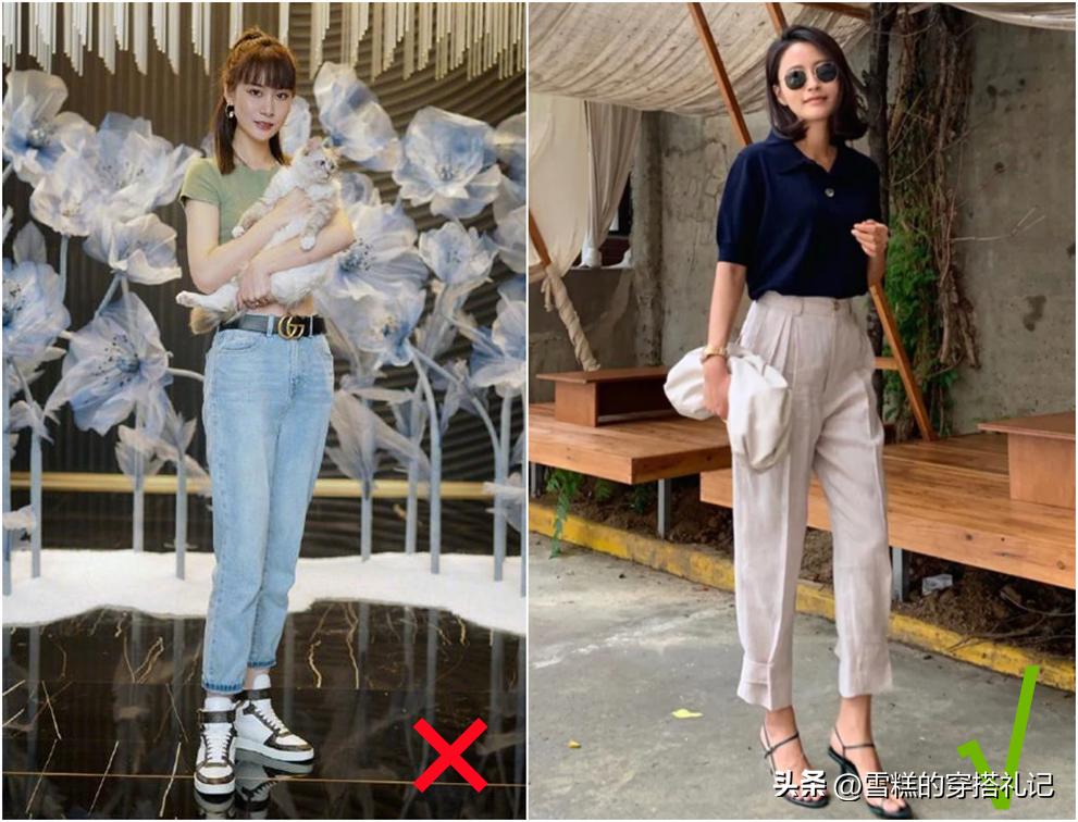 煙管褲要有一定的寬度打造鬆弛感纔好看,否則緊繃繃的,即使有上寬下收的型,也沒有明顯顯瘦的效果。我們對比兩邊的煙管褲就知道了,前者的材質厚且緊繃,後者的材質軟而鬆弛,一看就清爽又遮肉。正好大夏天的,大家也更偏向於軟而輕的面料,厚重感的必會被淘汰。