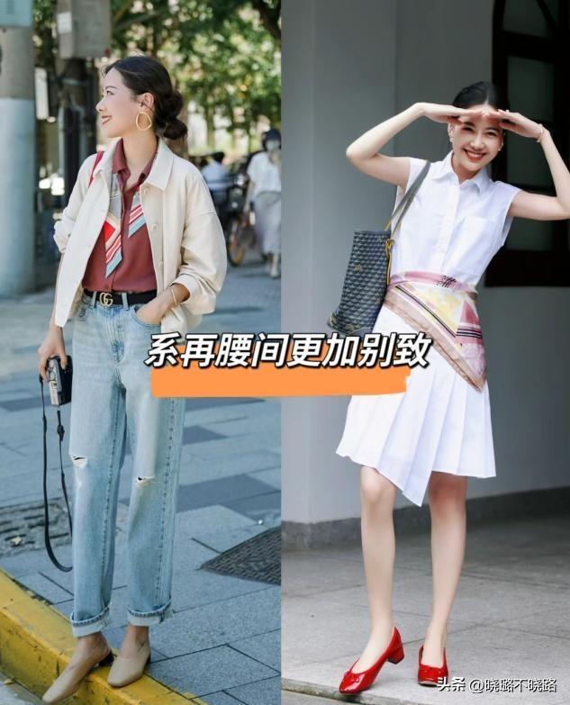 大家也可以將絲巾摺疊或者完全展開,卷邊打結系在腰間,這樣既可以豐富整個造型的層次,又可以突出腰線,分割身材比例,對於身材五五分的女人來說非常的友好。尤其在穿一些寬鬆款式的連衣裙和襯衫的時候,腰間繫上絲巾之後可以輕鬆地拉緊腰身,突出豐滿的腰臀比,給整個身材帶來更多的曲線魅力。