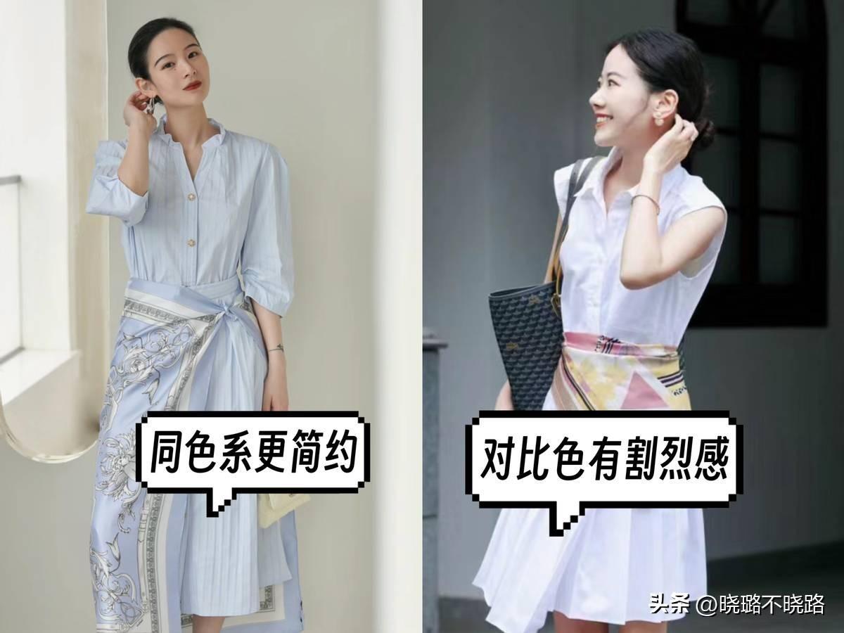 >>>>同色系列:當絲巾的顏色選擇與服裝保持一致的時候,可以使得整體的銜接更加自然,而且完全不用擔心,有種突兀感,同時也要提醒大家,稍微長一些的方形絲巾系在腰上的效果會更好一些。