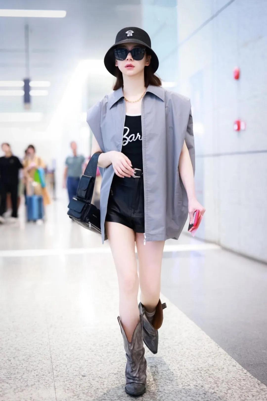 一件黑色的打底,搭配一件無袖外套,這樣的組合不但富有層次感,同時也展現了她的時尚品味。