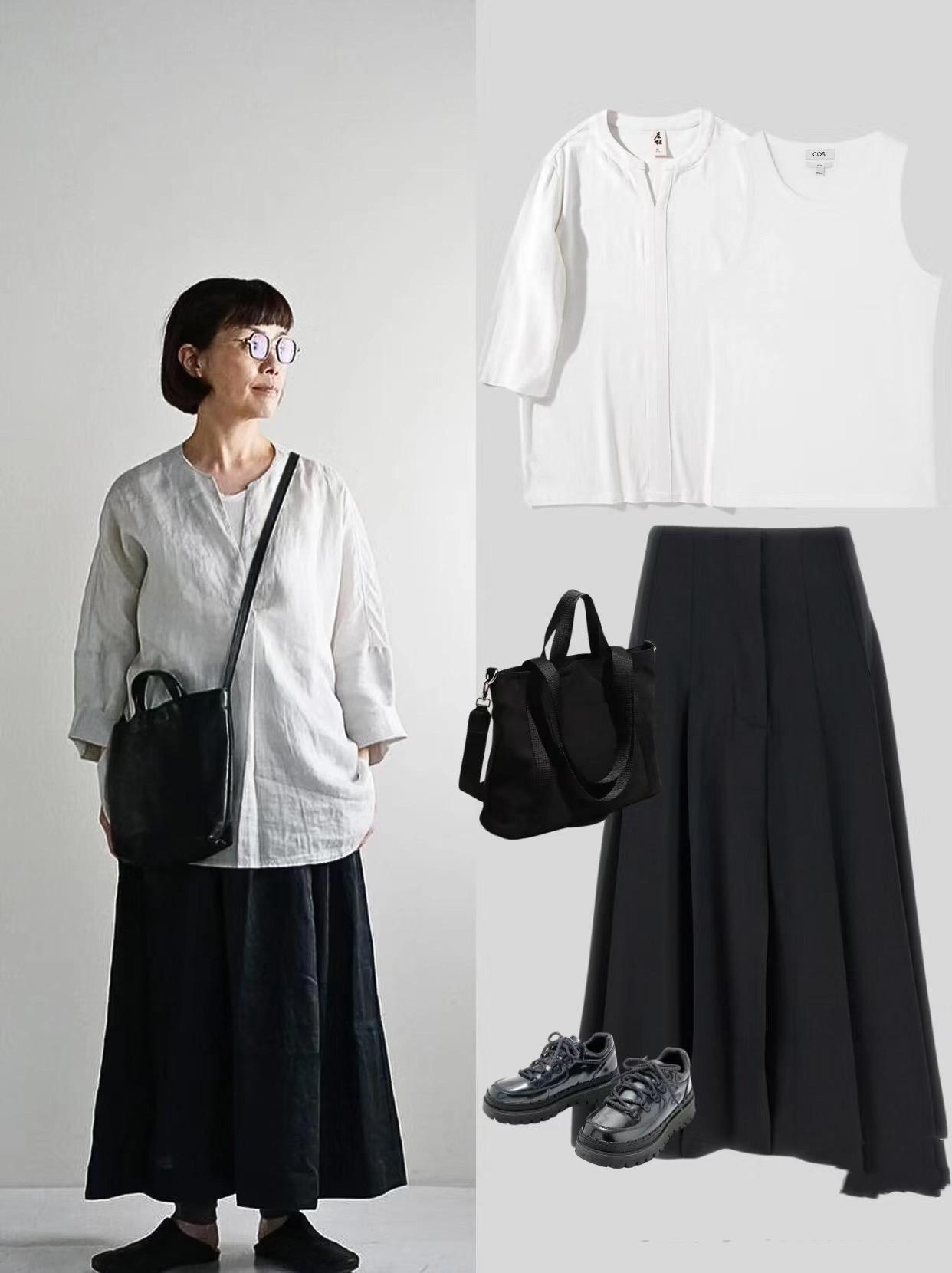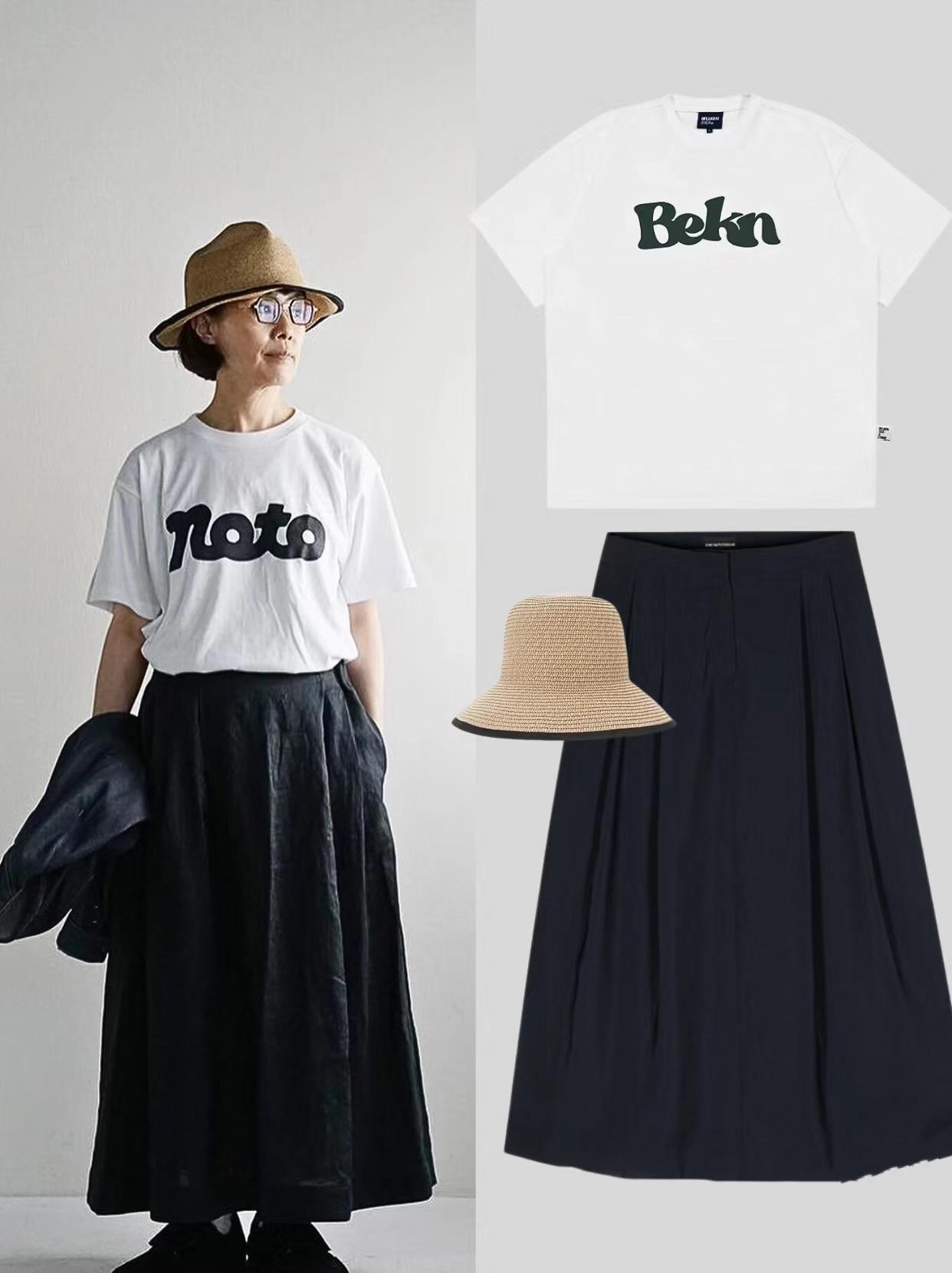 經典的黑白配,怎麼穿都不過時。50+的年紀,也可以穿上基礎款T恤,搭一條簡約風的半身裙。