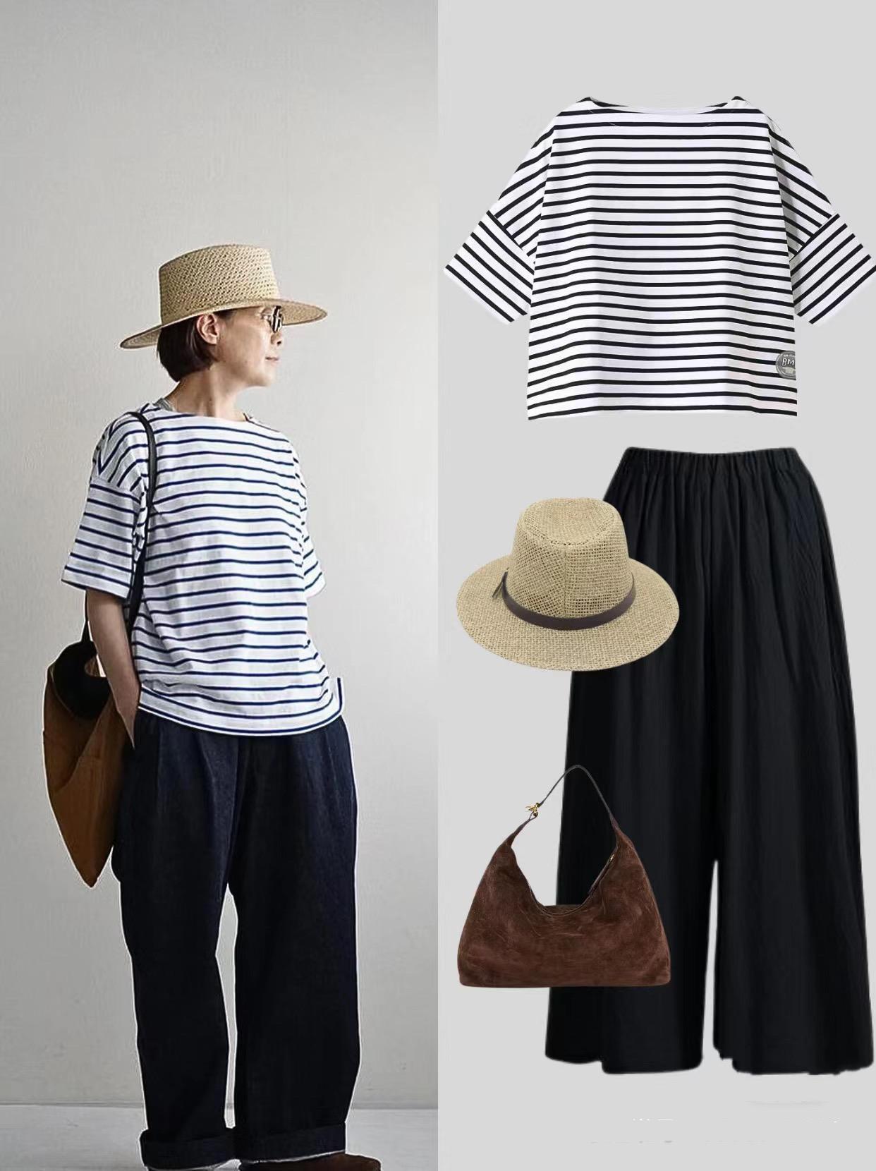 1、條紋T恤+闊腿褲