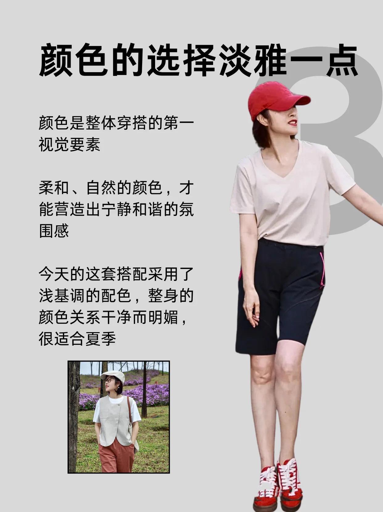 鄰近色、順色、以及柔和色彩的搭配,纔是營造清新氛圍的關鍵。比如裸粉色的T恤,配上黑色五分短褲,既溫柔又酷搭,也很大方。