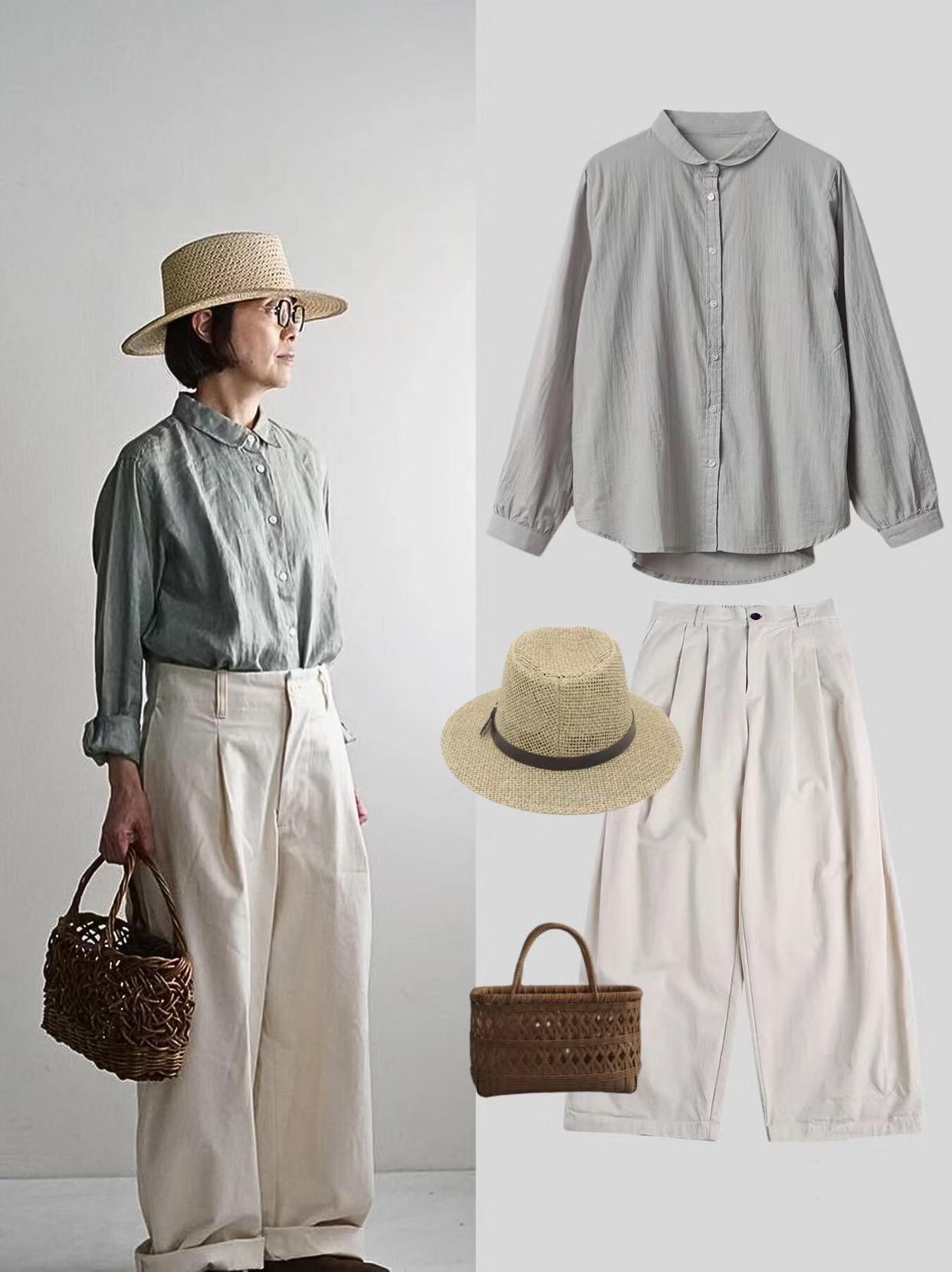 6、棉麻襯衫+米白色闊腿褲