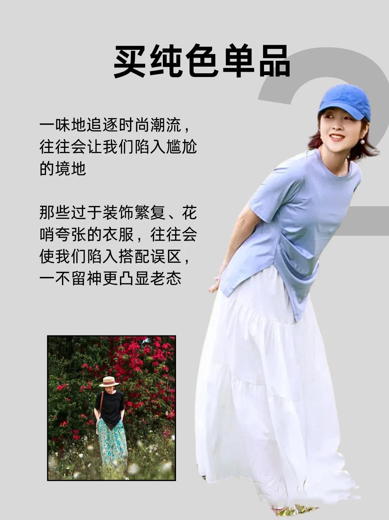 50+的女人的穿搭,不要太過豔俗。大面積土氣的印花、浮誇的配色,也很容易顯得老氣。素雅與低調,也是一種態度。