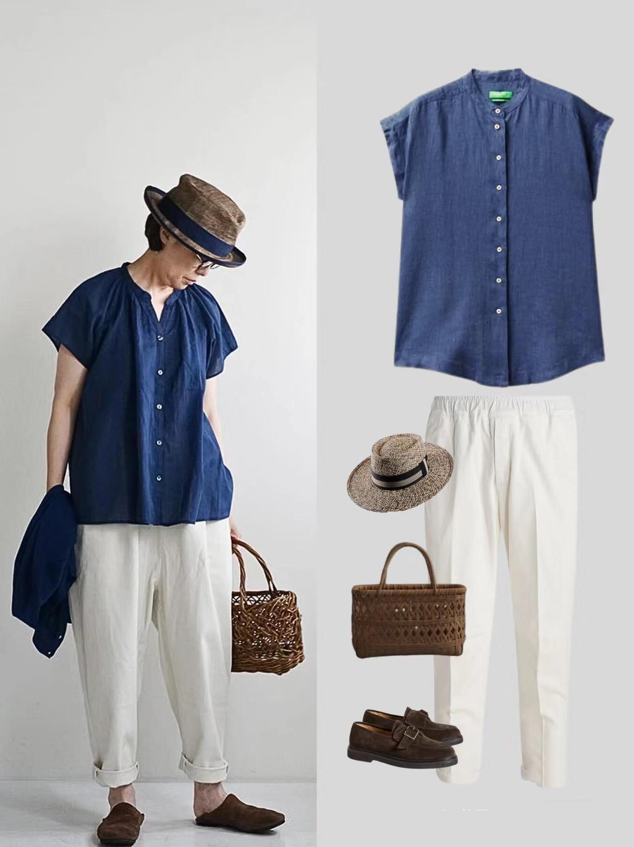 50+的女人,偶爾想要文藝範的穿搭,便可以嘗試這一組素雅又低調的搭配。基礎款的小豎領白襯衫,疊搭工字背心,保守又耐看。
