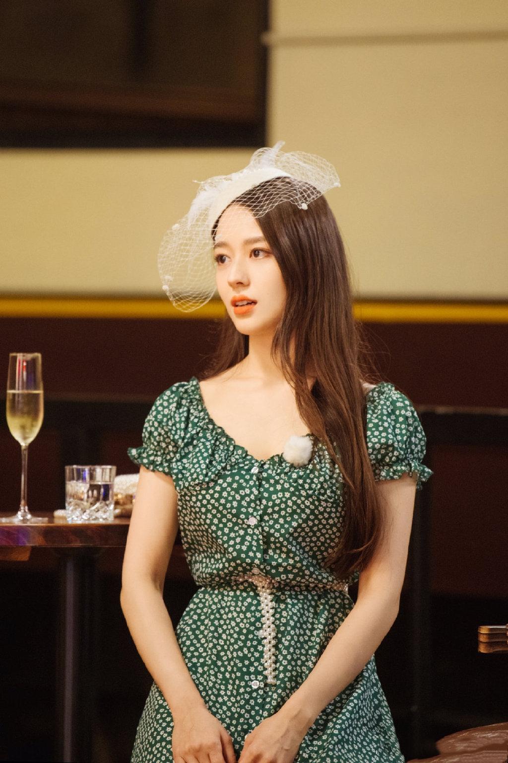 吉娜選擇的是波點綠色連衣裙,略微有點寬鬆的款式,讓她整個人變得輕盈靈動,頭紗的點綴讓她多了一絲優雅的氣質。