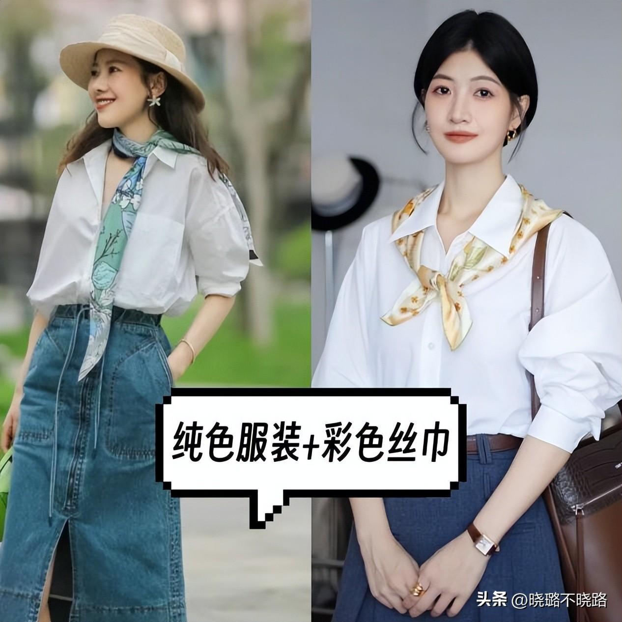 除了常規的兩件式疊穿方法,還可以藉助一些小面積的單品進行疊加,富層次,同時也不會加重厚重感。比如像圓領款式的上衣或者連衣裙,疊加一條纖細的絲巾就非常的好看,可以突出頸部的線條,同時也可以彰顯層次感。但是需要記住,如果是簡約色系的服裝,搭配上帶有印花的絲巾效果更加出色。