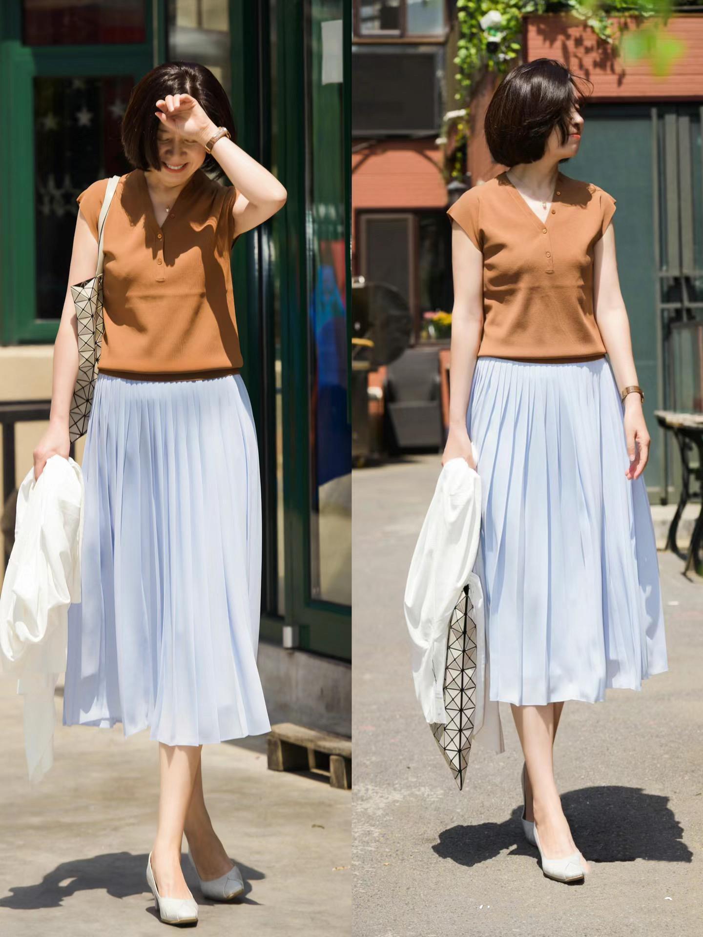 夏天裏的大地色不可以大面積的運用,但小面積嘗試大地色、會給人一種更溫柔知性的美。大地色的小飛袖上衣,配淺藍色百褶半身裙,溫柔又有力量。