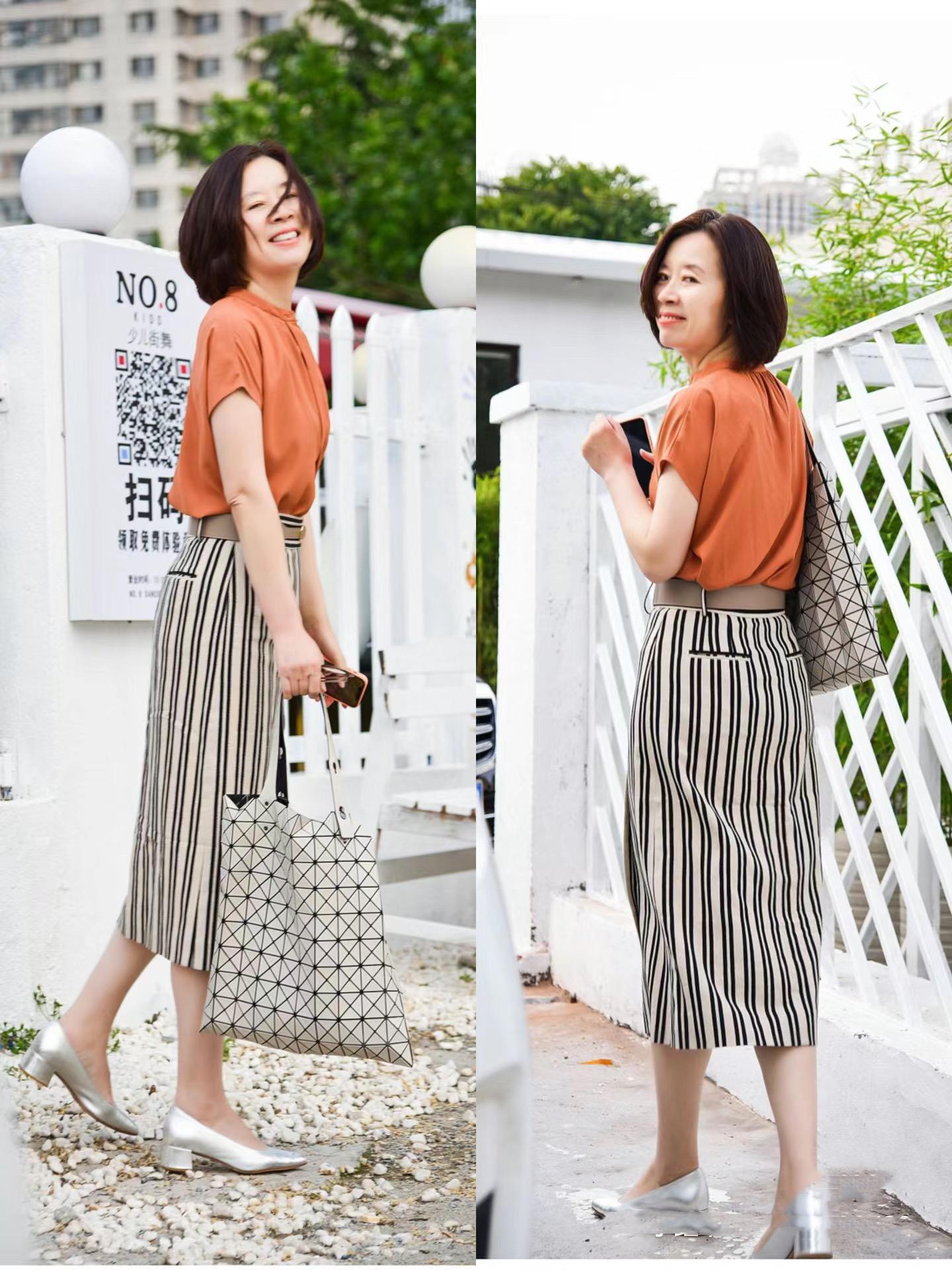 用南瓜色的襯衫,來搭配黑白色的條紋半身裙,不僅修飾腰臀部的曲線、還更拉伸了縱向比例。這種小飛袖的襯衫,選擇天然面料、夏天穿起來更舒服。