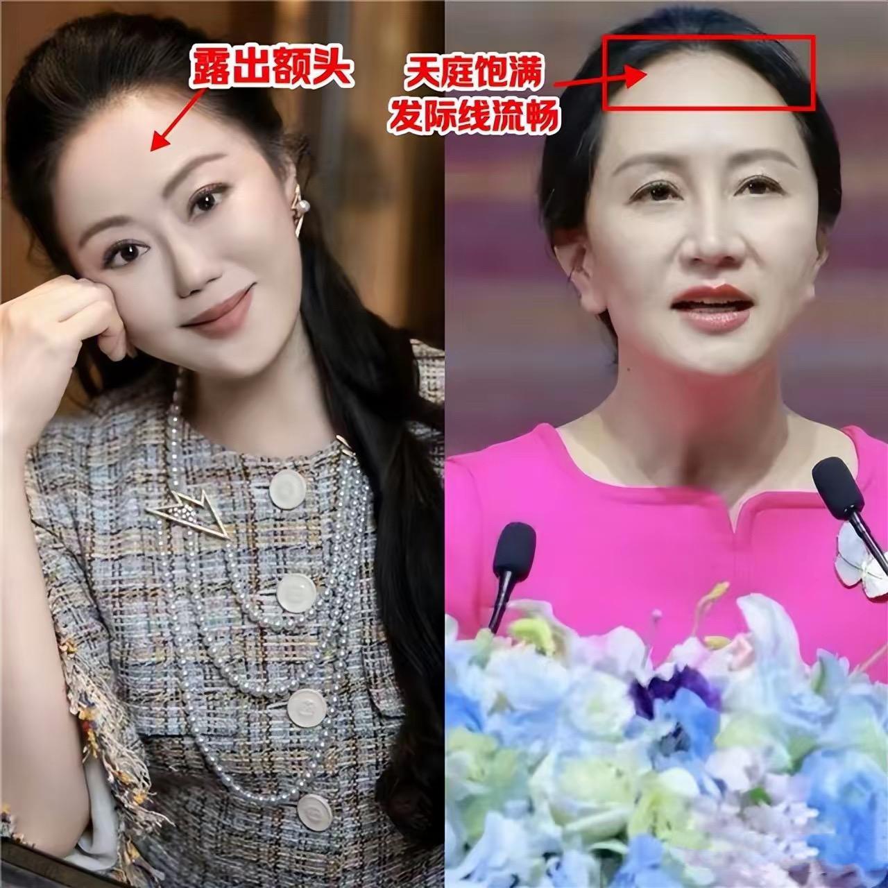 比如華爲長公主孟晚舟、名媛貴婦章小蕙,她們都擁有更加圓潤流暢的額頭,而且喜歡將頭髮挽起、露出光潔的額頭,露出額頭也會讓臉型看起來更流暢。