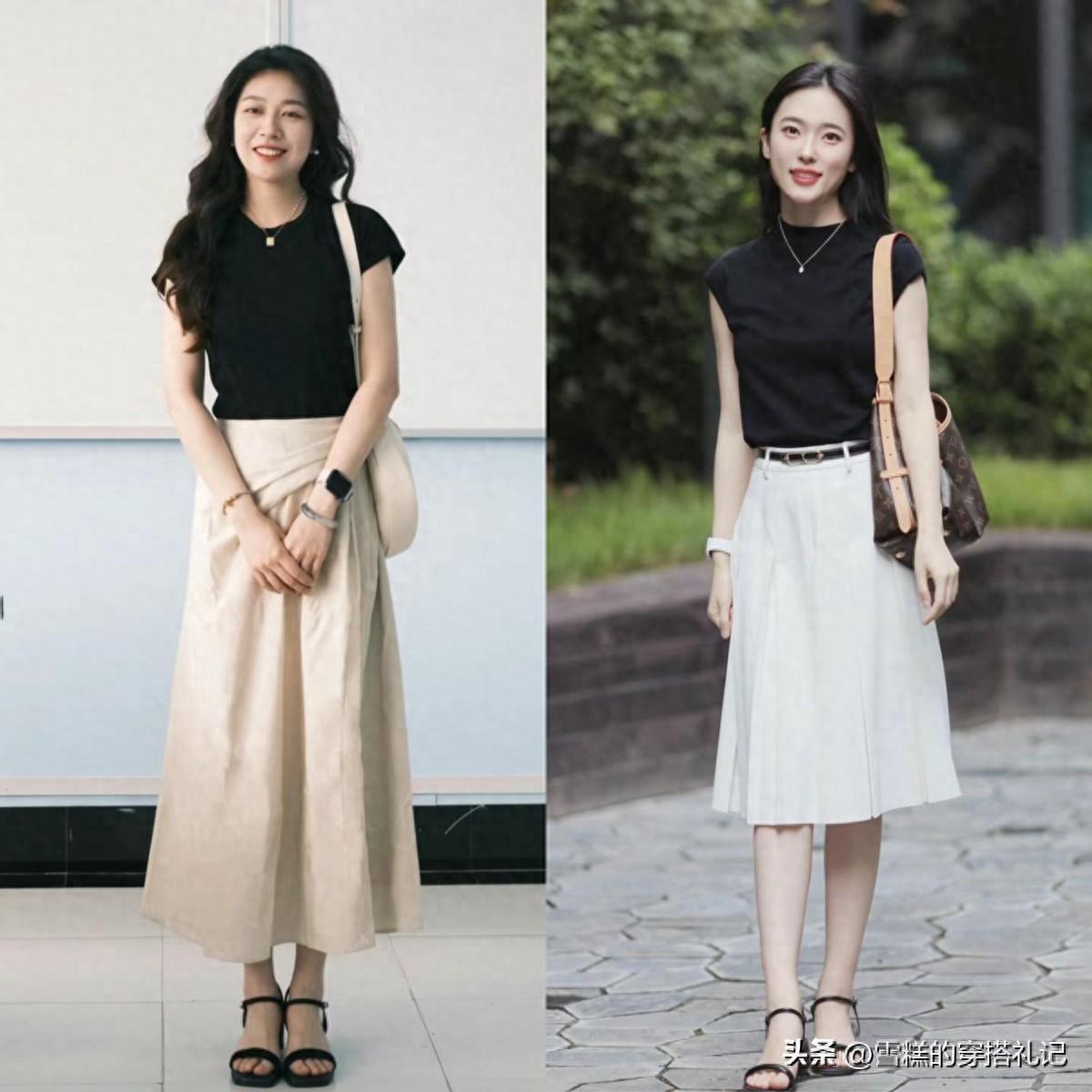 優先選擇裙襬垂感好的收腰裙,長度不能遮住腳踝,再搭配一雙粗跟款式的一字帶涼鞋,不僅可以增添舒服的腳感,而且小個子還可以穿出顯高的效果。
