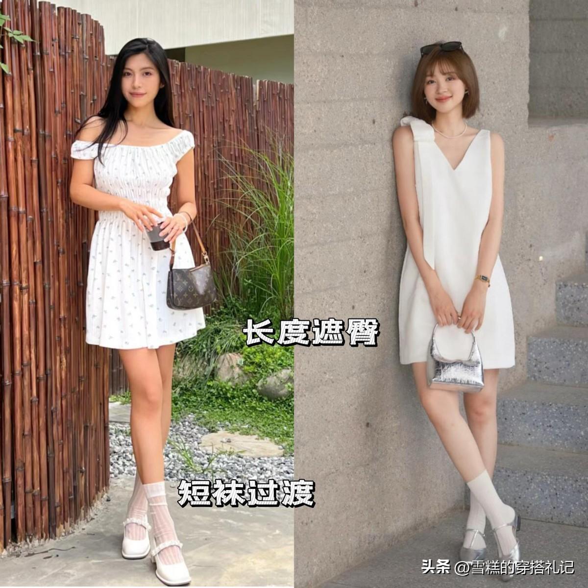 小白裙可以加入一點設計感,例如領口的捏褶設計、不對稱剪裁、碎花圖案等等,都可以提升亮點,搭配白色短襪,輕鬆拉長腿部比例。