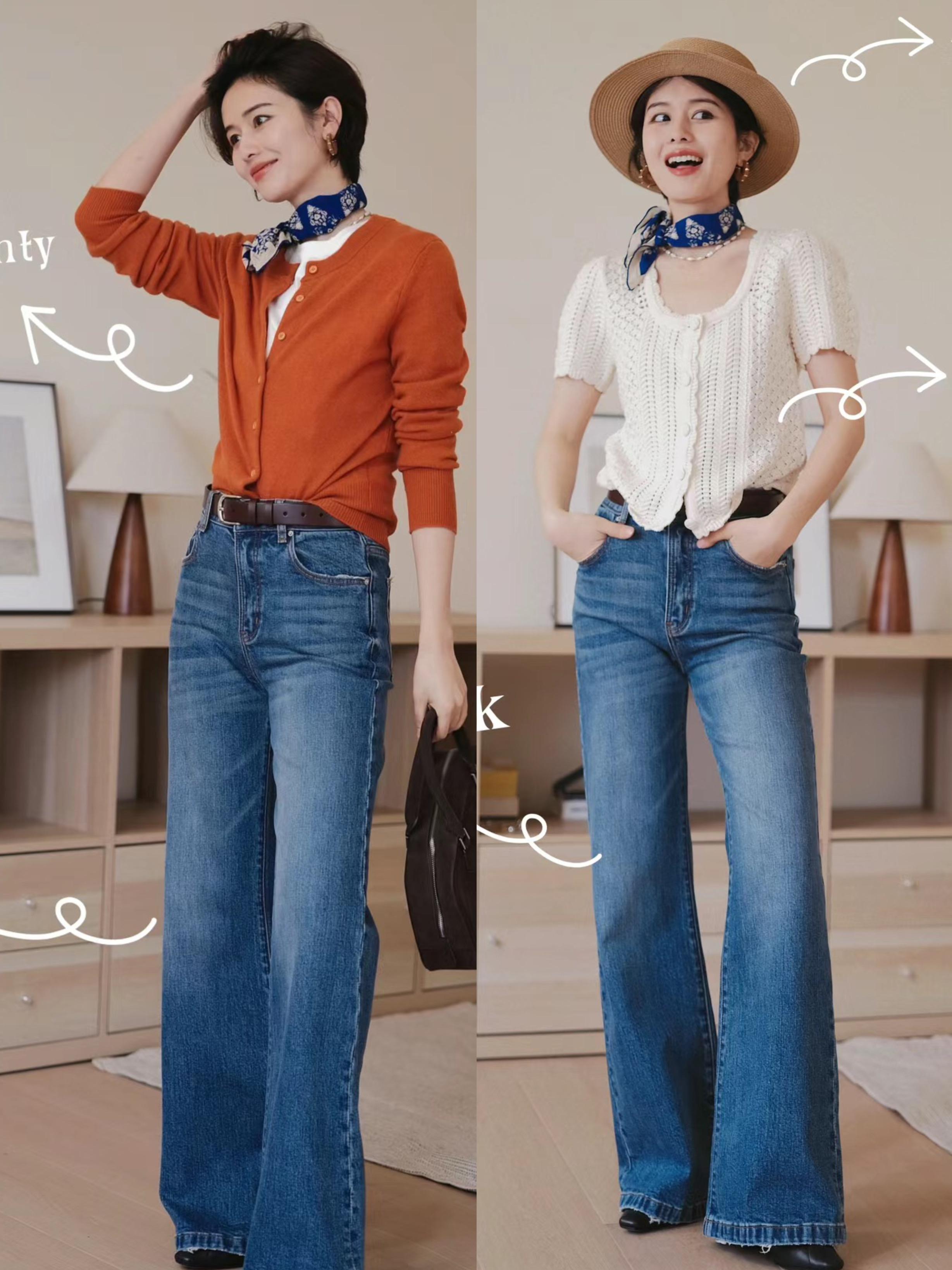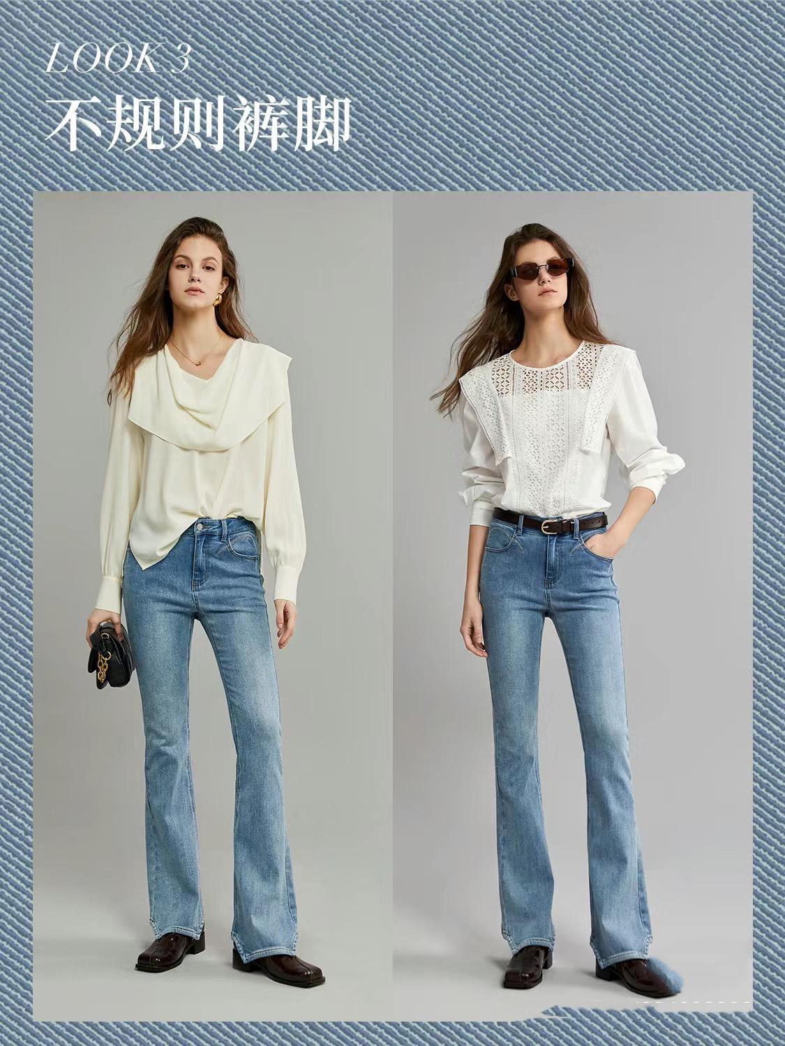 這種褲子,選擇微喇剪裁,上窄下寬、也是上世紀八九十年代喇叭褲的改良版。
