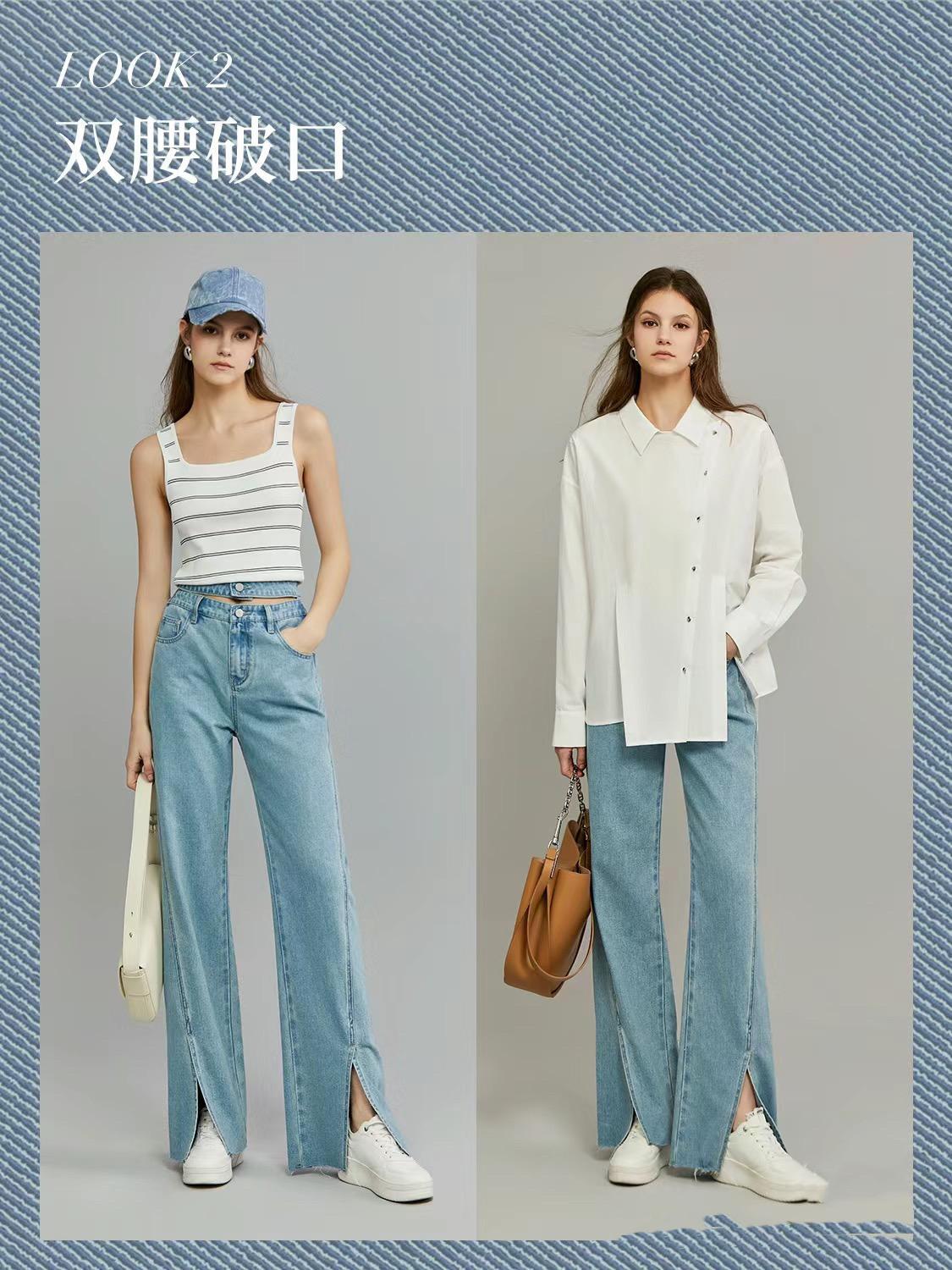 微喇褲的選擇亦是如此,相對於常規的腰部剪裁,雙腰破口更潮流、更新穎。