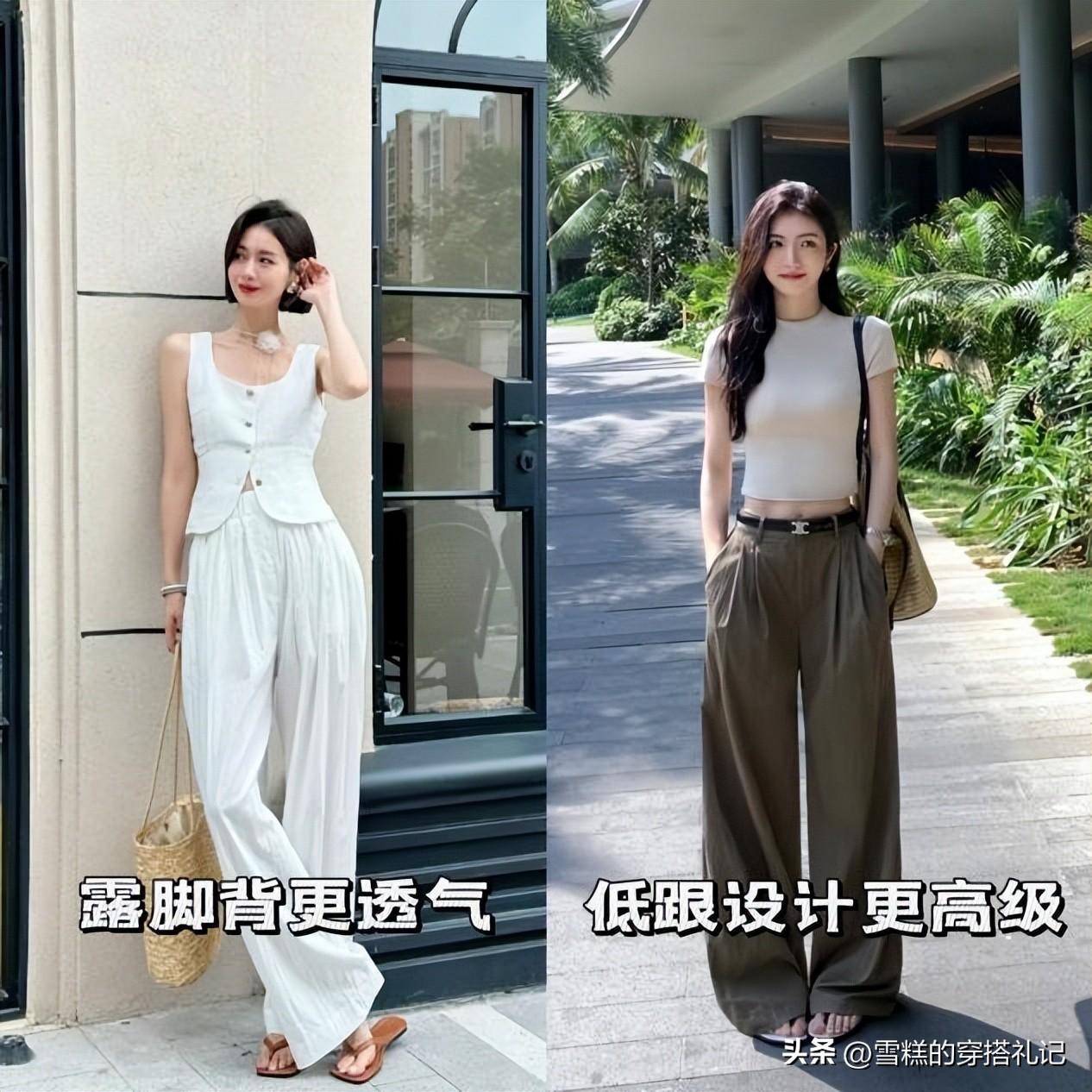 時尚洋氣的山本褲完全可以搭配具有設計感的拖鞋,腳感舒適,同時保留足夠的露膚面積,可以更好地製造出輕盈感,完全不用擔心顯矮顯胖。而且像這種鞋面不規則的涼拖鞋,可以更好地修飾腳型。但需要注意山本褲不要完全的遮擋住拖鞋,露出一半的鞋頭會更加的優雅精緻。