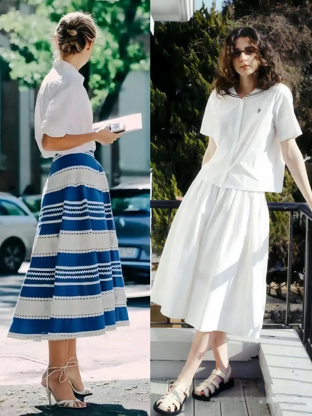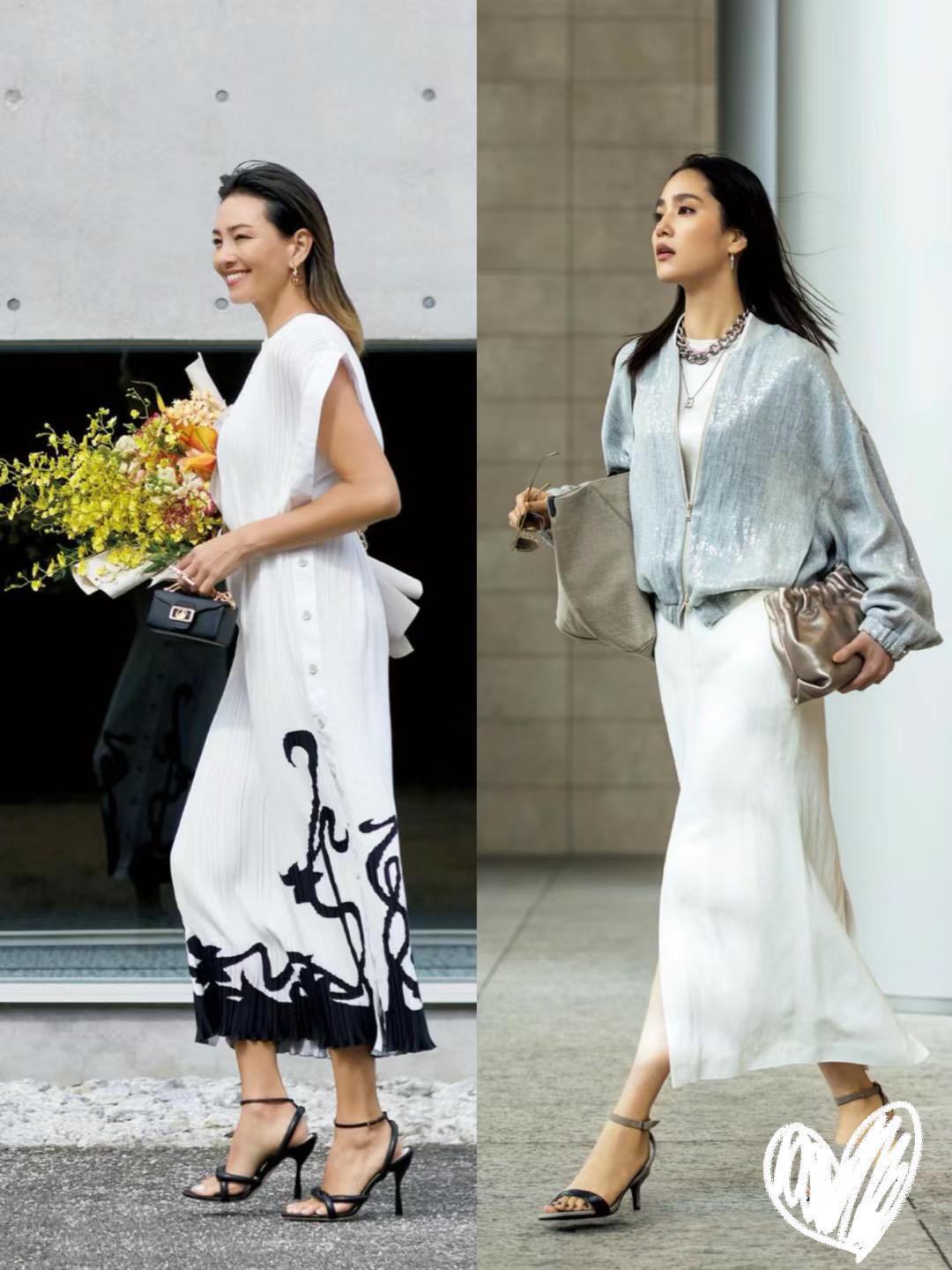 裙越素,鞋越靚。這樣才能讓我們的穿衣不乏味,比如基礎款白色過膝裙、或者文藝海軍風的條紋半身裙,都可以配帶有設計感的高跟鞋。