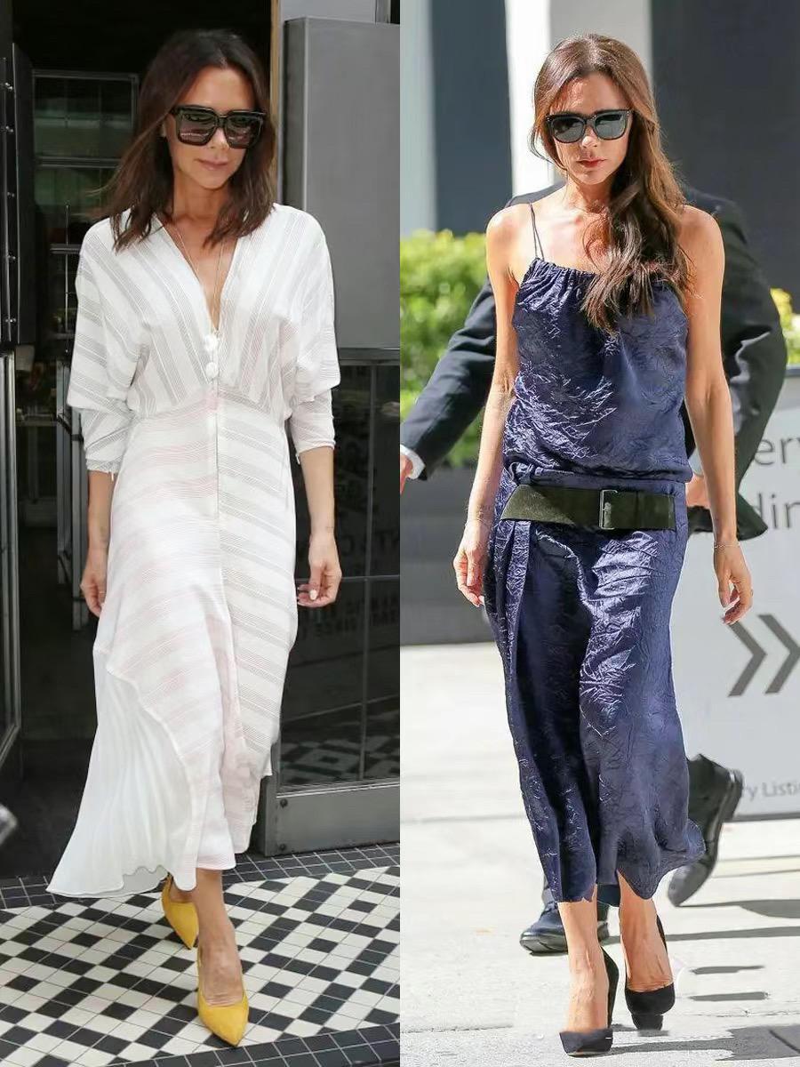 既要時髦洋氣、優雅端莊體面,貝嫂的尺度拿捏非常高明。細長的V領、清爽的吊帶,配上過膝的裙襬,時髦中帶着浪漫,女人味十足。