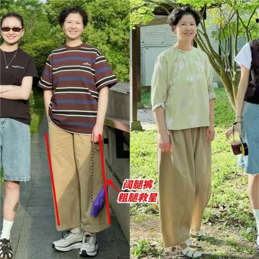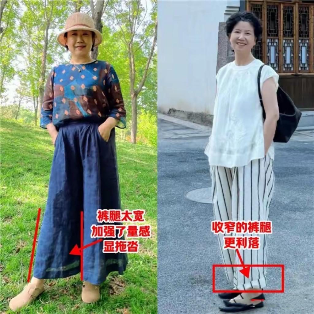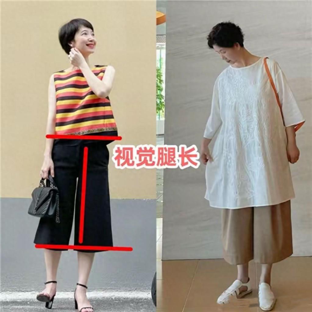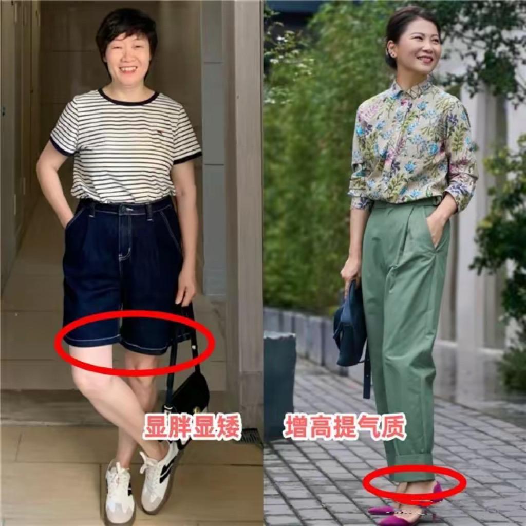中年女人體型臃腫,一不小心就會拉寬橫向比例,顯得身材五五分。尤其是基礎T恤配七分短褲的時候,可能有一種上下五五分的效果。