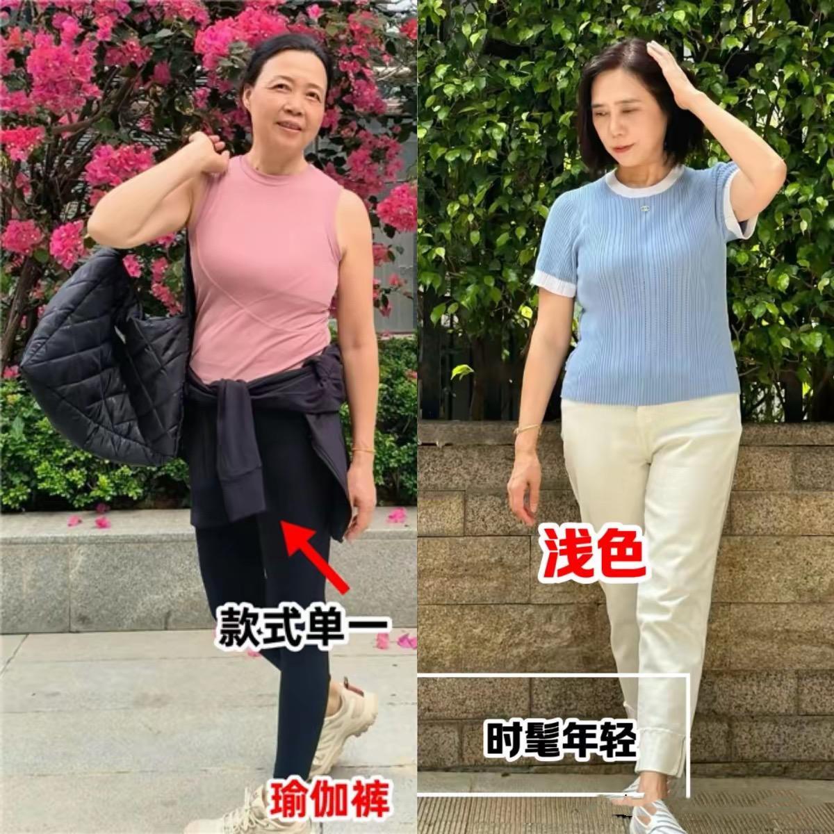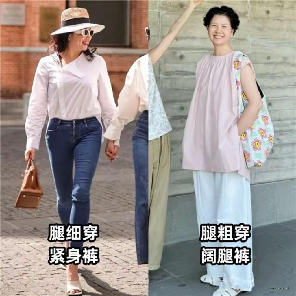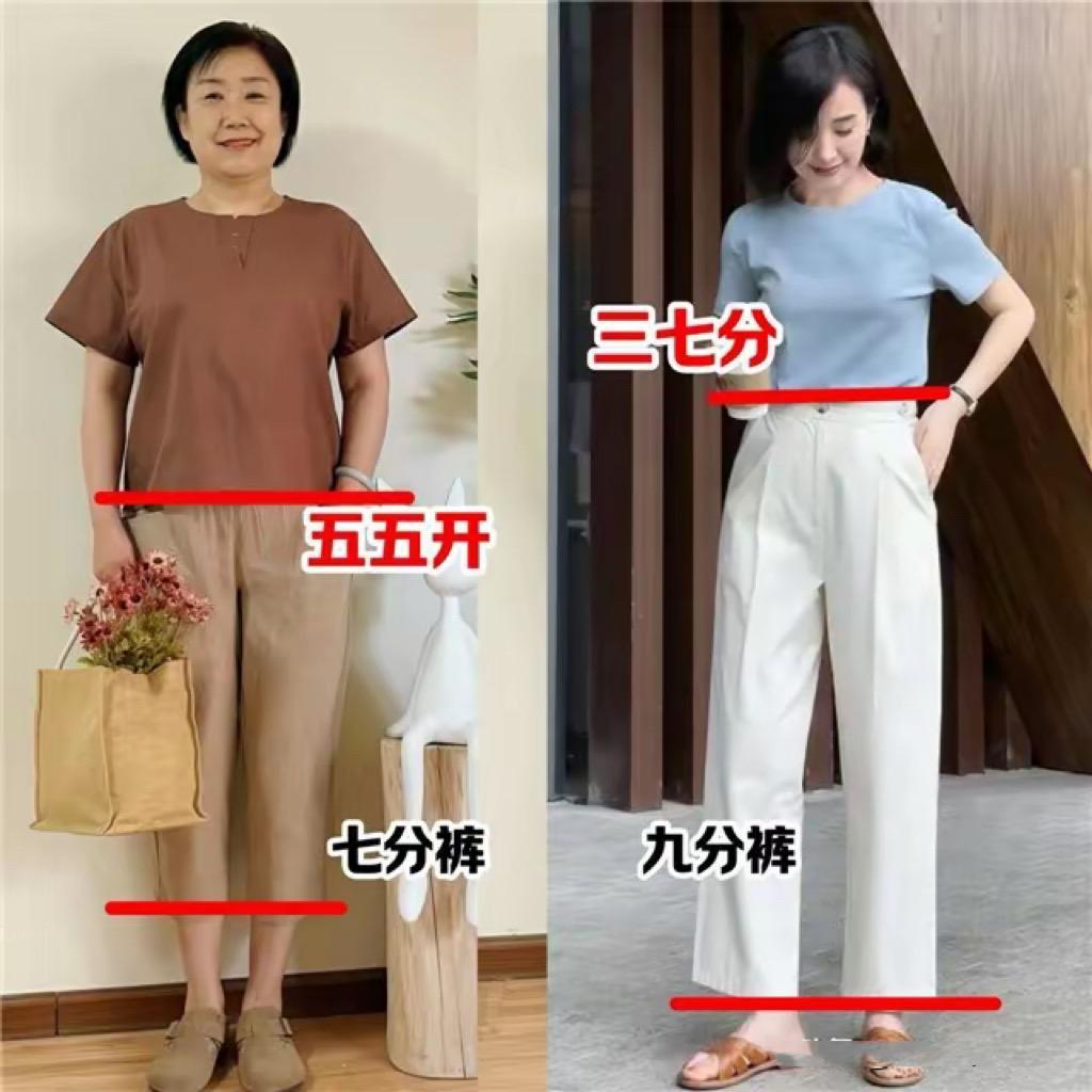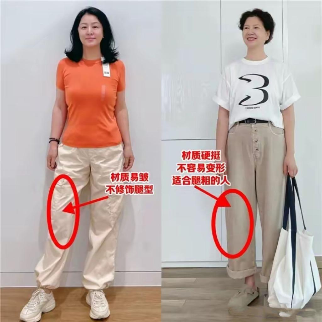 中年女人體型臃腫,一不小心就會拉寬橫向比例,顯得身材五五分。尤其是基礎T恤配七分短褲的時候,可能有一種上下五五分的效果。