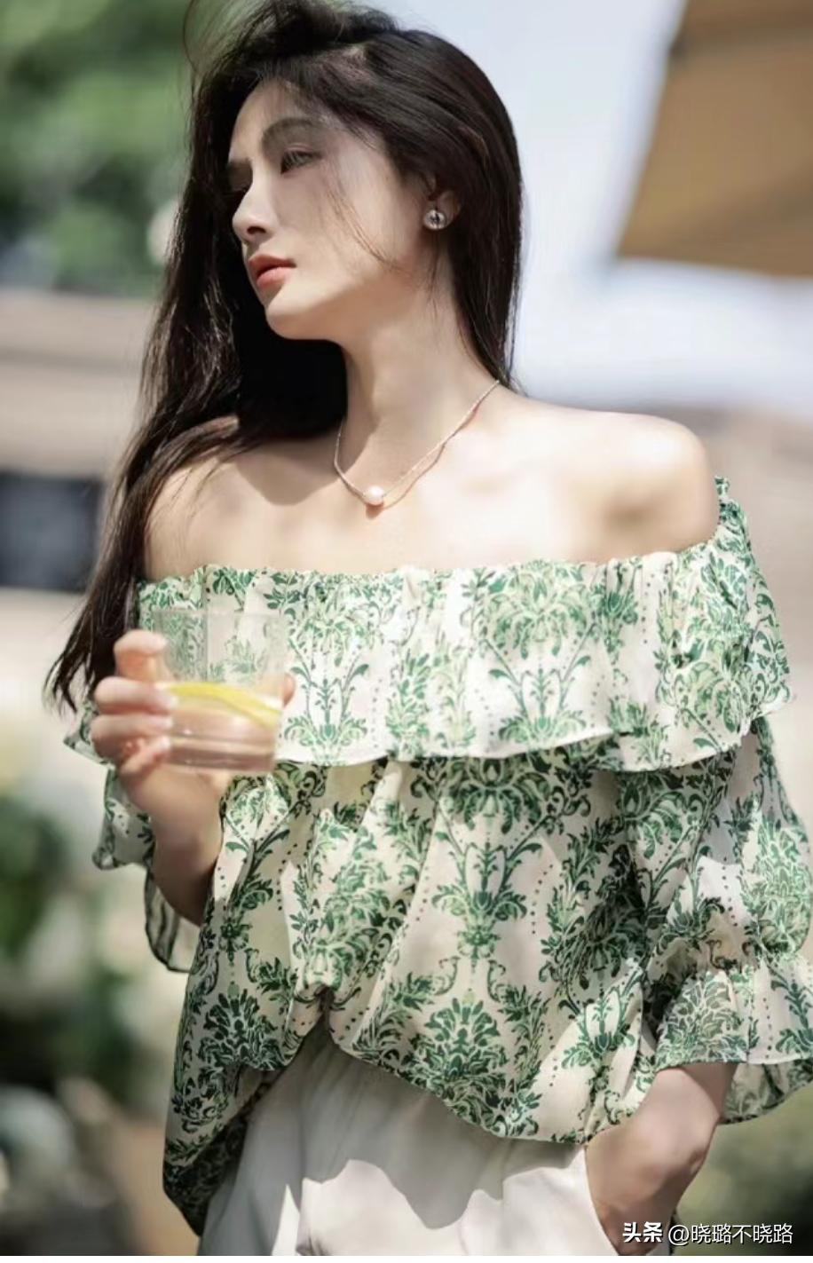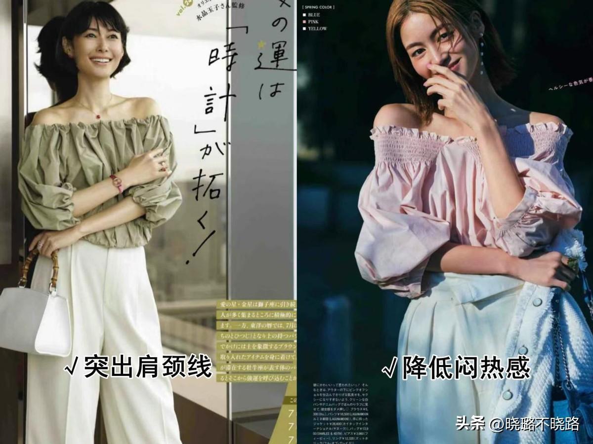 夏天的時候,我們也應該學會在全身穿搭中進行留白,避免過於的沉悶,尤其肩頸線比較優越的女人,更應該多像日本雜誌學習試試這種一字肩款式的上衣或者連衣裙,整個領口是平領的設計,露出大片的鎖骨和肩膀後,反襯的整體都纖細了不少。