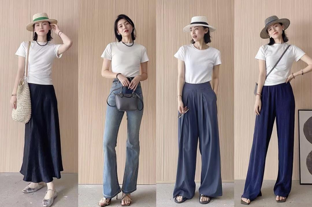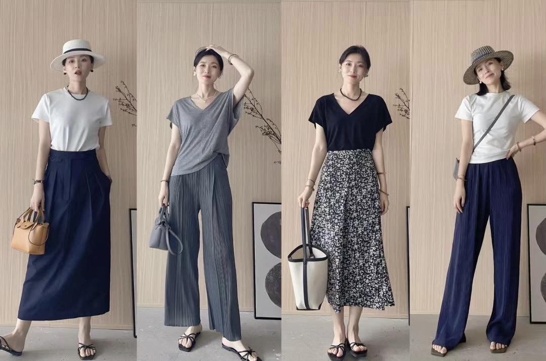 上班通勤的日子,我們的穿搭應該儘量低調一些。基礎款的T恤,可以配高腰的闊腿褲,也可以搭配高腰的A字形半身裙。