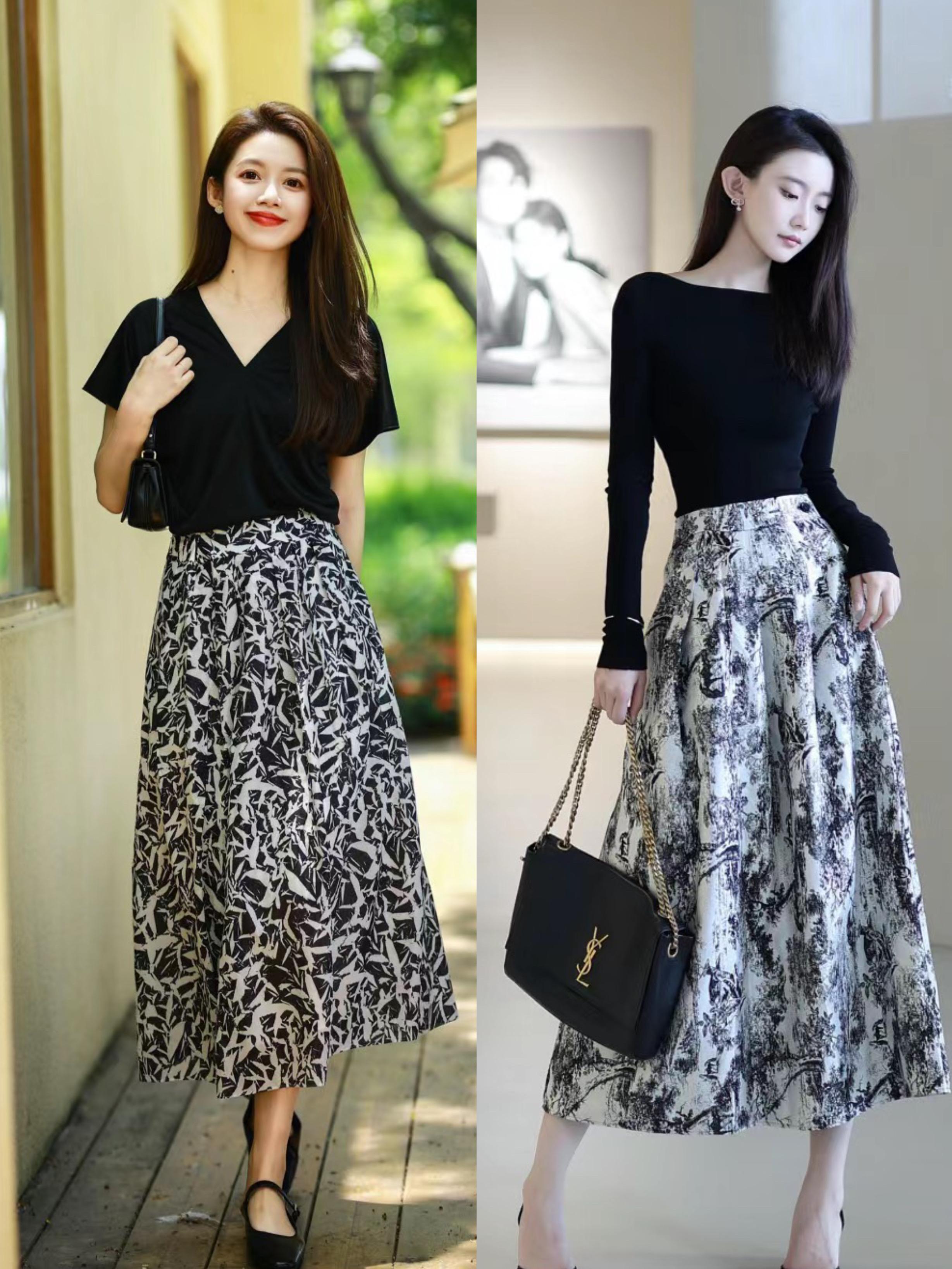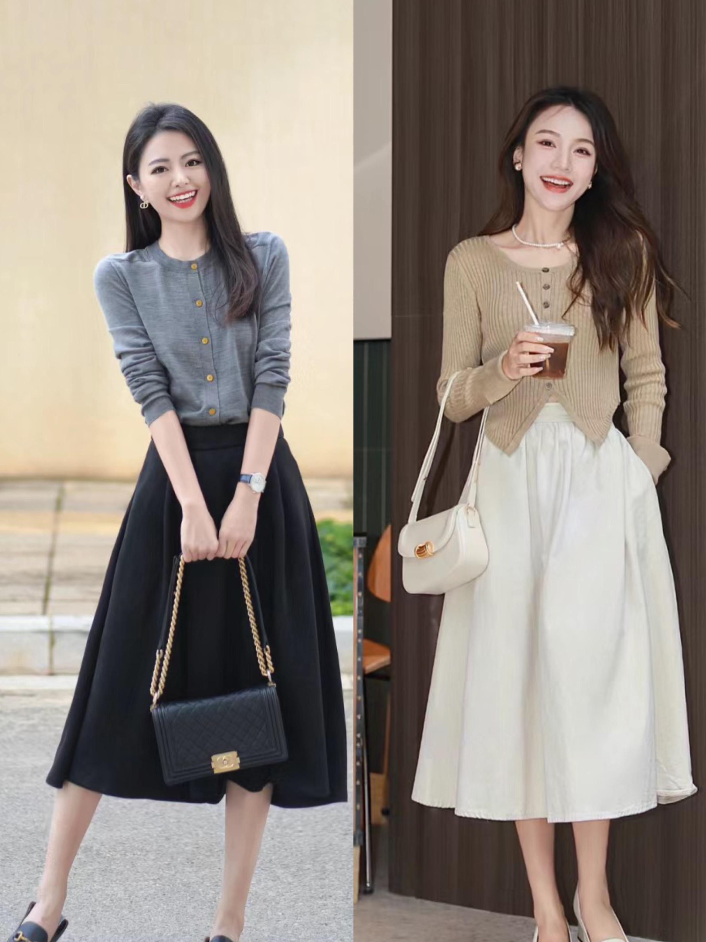 極簡風的赫本半身裙,可以選擇更高級顯瘦的黑色系、也可以搭配輕盈溫和的白色系。高腰線、大裙襬,藏肉效果一流。