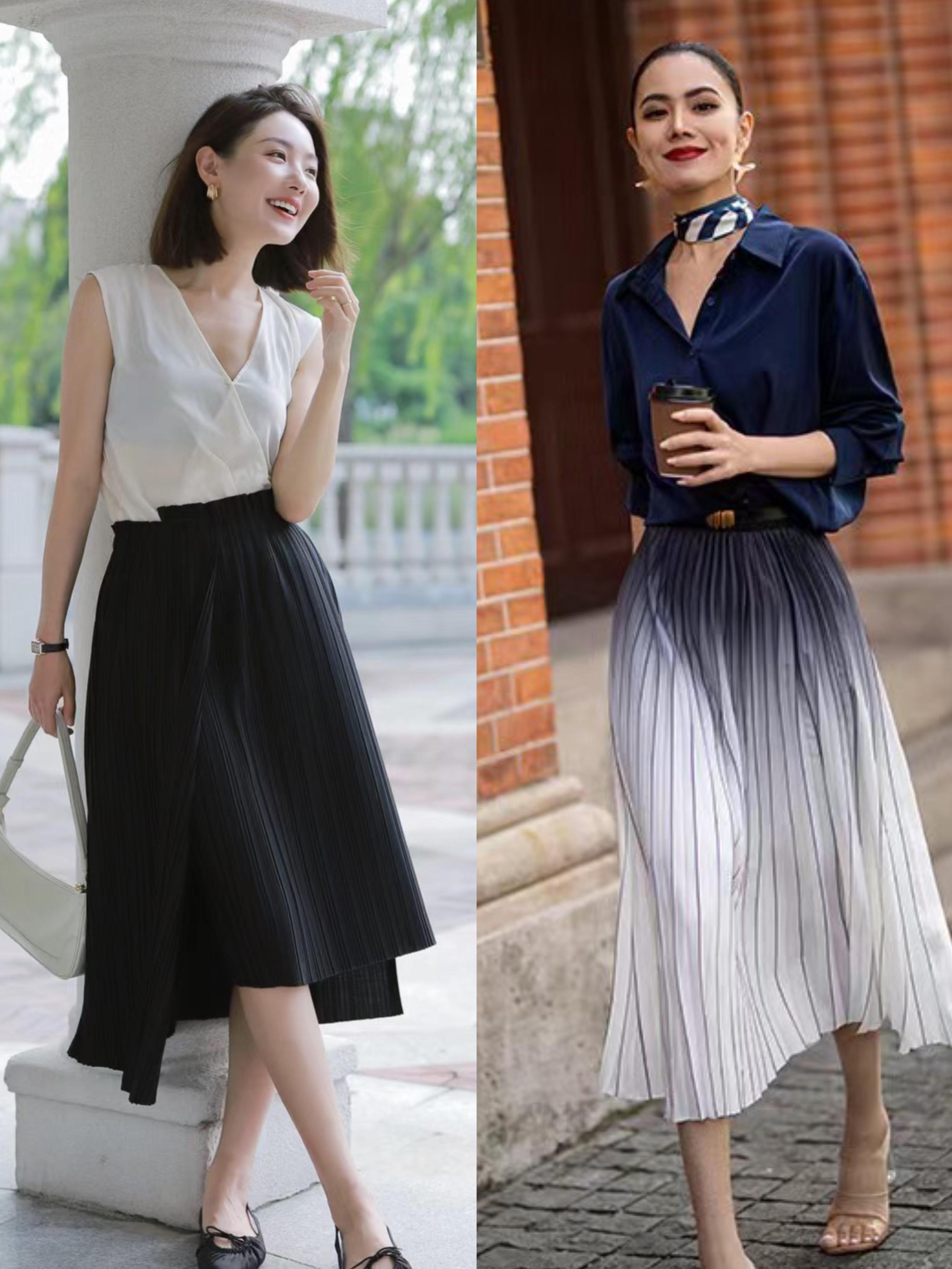 選擇百褶半身裙的時候,儘量搭配高腰+A字形剪裁,配合流暢的線條,塑造出一種更自然直觀的美。