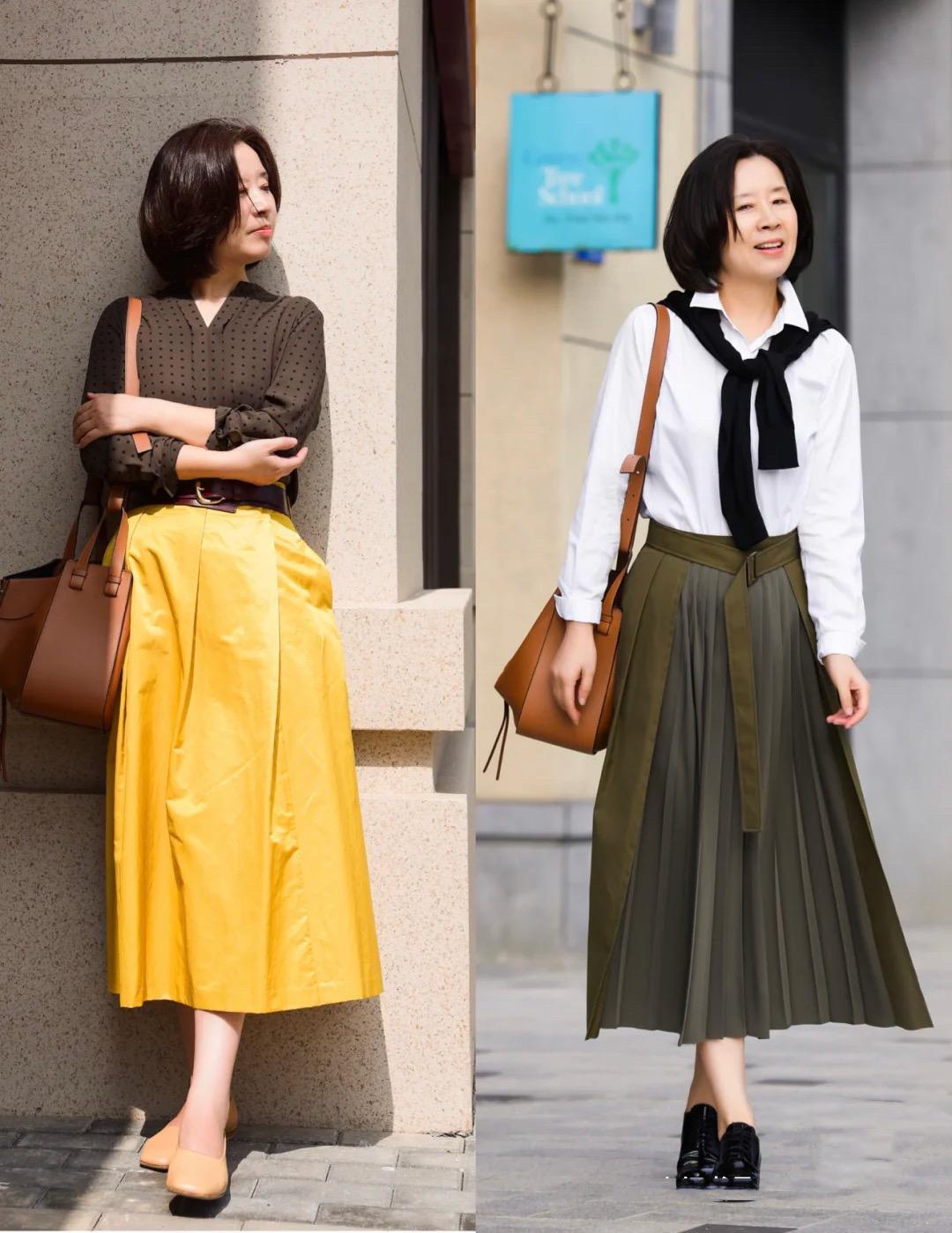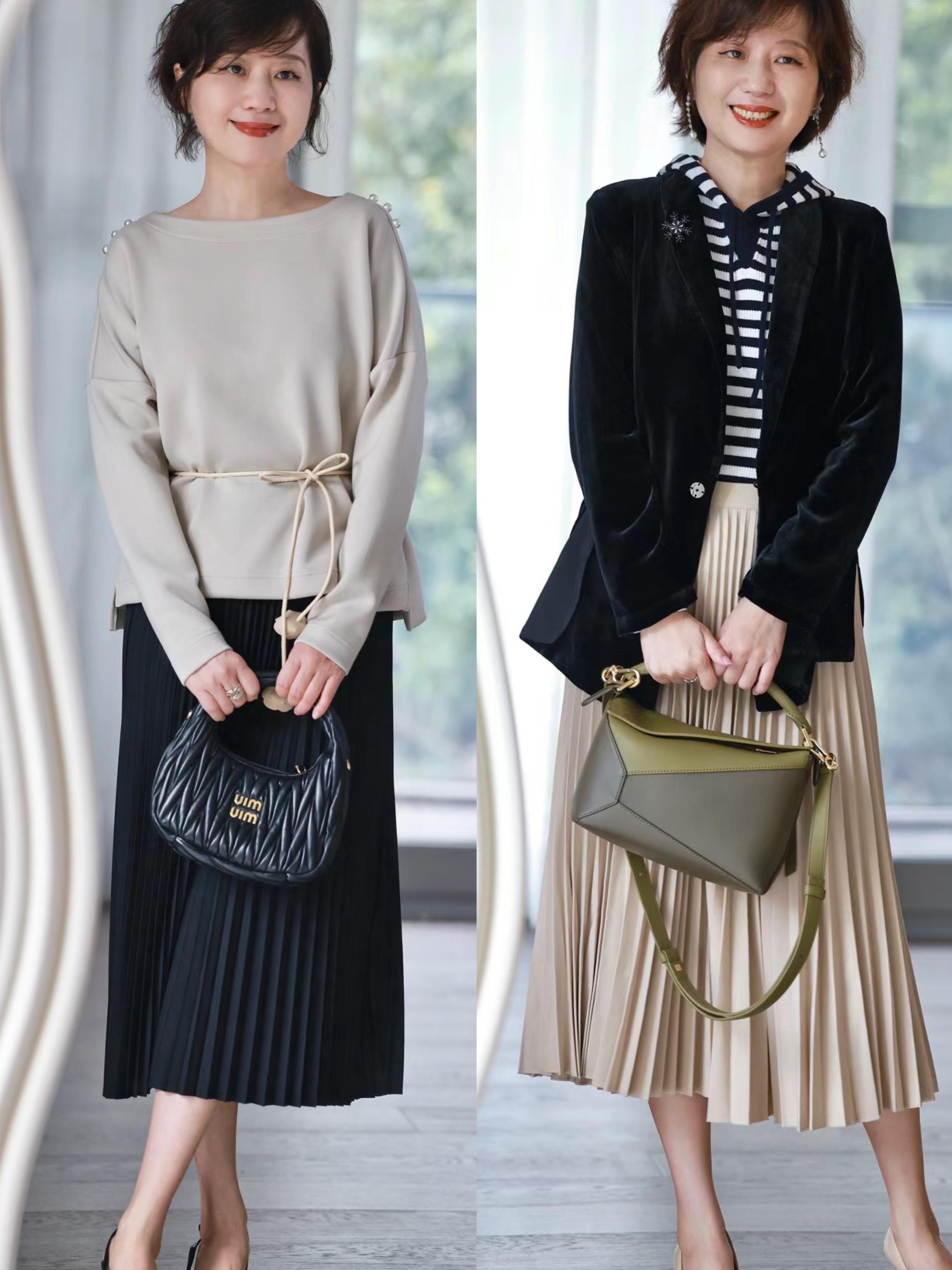 如果說醋酸裙最大的優勢是華麗顯貴,那麼百褶半身裙最大的優勢就是輕盈藏肉。50、60歲的女人,小肚腩、大寬胯、大粗腿,都是常有的。