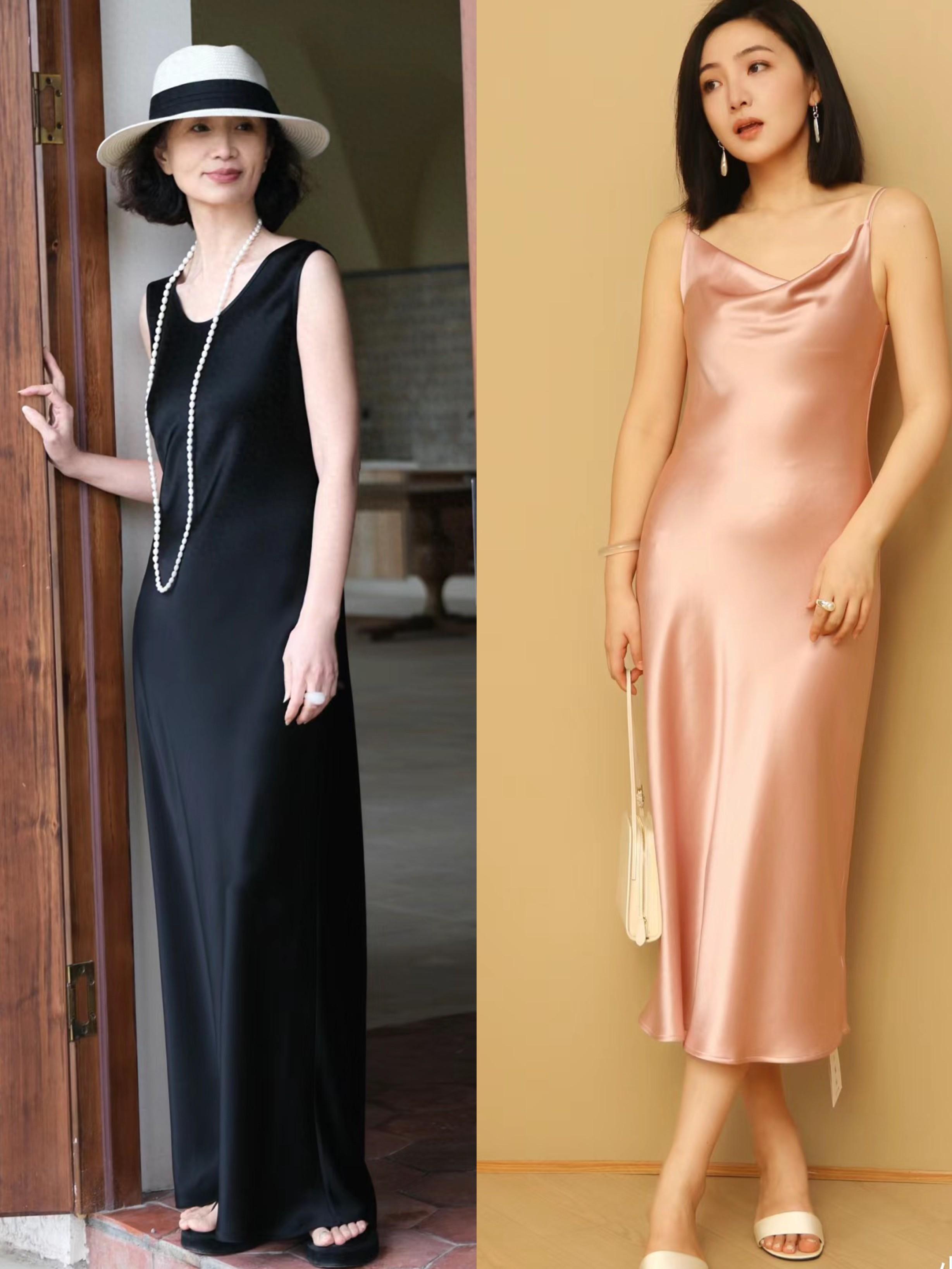 細膩、順滑、且帶有光澤感的醋酸裙,運用了獨特的醋酸纖維面料,上身輕盈洋氣又顯貴,與50、60歲女人的貴氣感更加匹配。