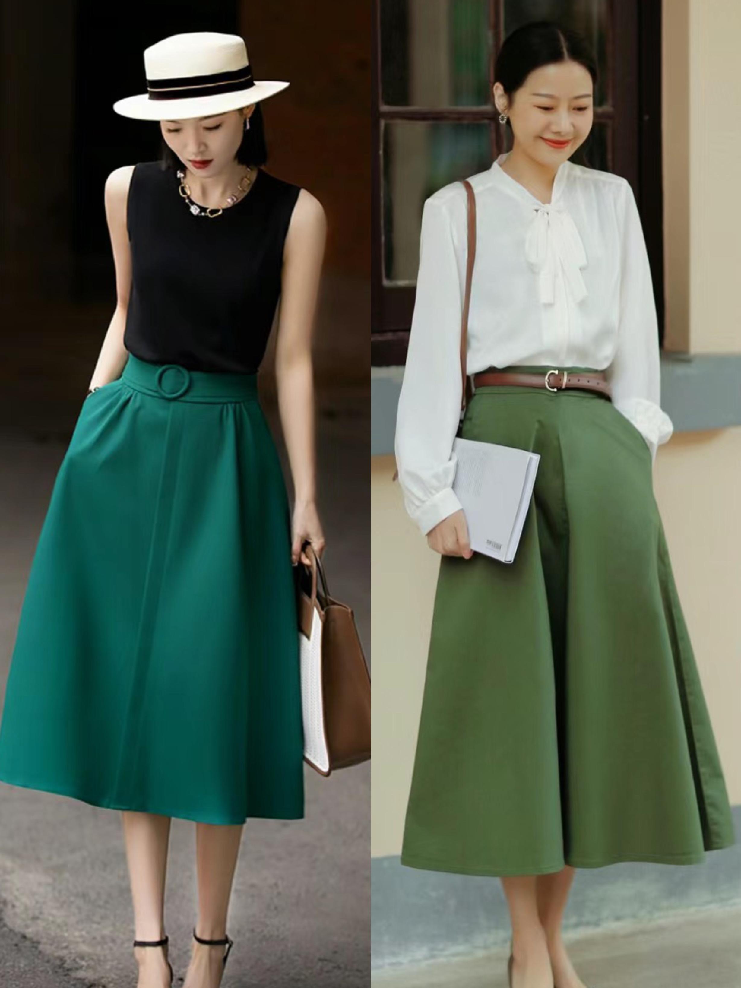 孔雀藍或者軍綠色的赫本半身裙,儘量搭配挺闊、硬質的面料,版型更加華麗。這種赫本半身裙,不管是配襯衫、還是背心,都更具視覺衝擊力,很醒目。