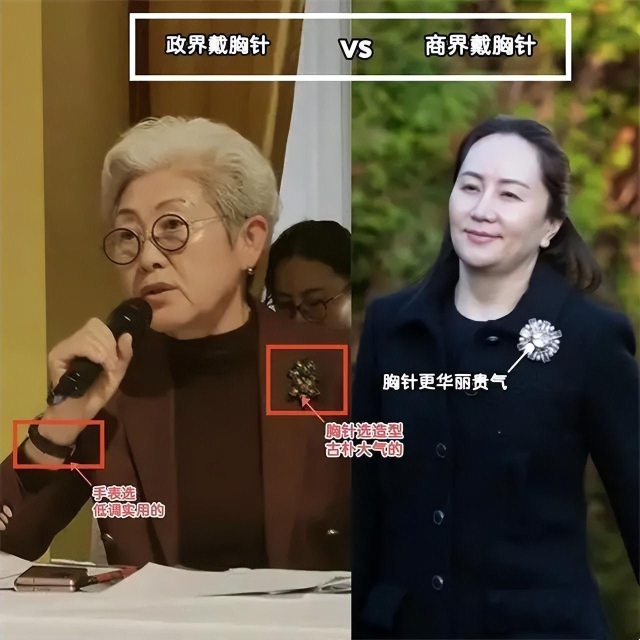 傅瑩的穿搭中,配飾的點綴也恰到好處。利落幹練的西服外套,配上古樸大氣的胸針,低調實用的手錶,也象徵着自己的身份和地位。