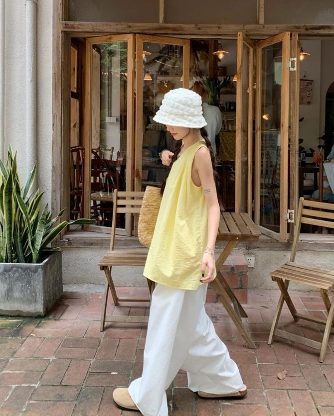 夏天就是要選擇清爽一些的顏色,白色的闊腿褲和鵝黃色的背心上衣,它們的版型都是寬鬆的,組合在一起可舒適自在了,充滿陽光活力,夏日氛圍感直接拉滿了。這種鬆弛感的穿搭,真的很難不讓人喜歡。