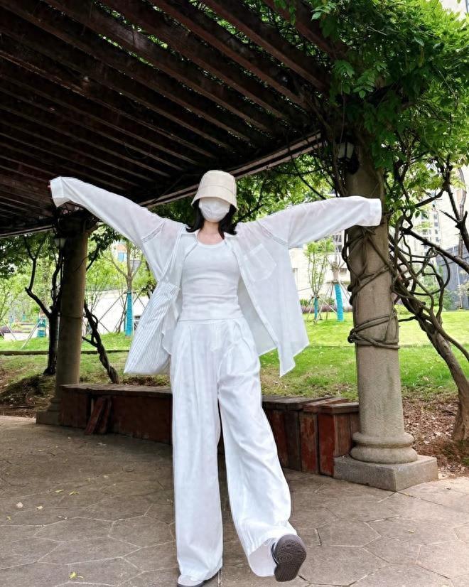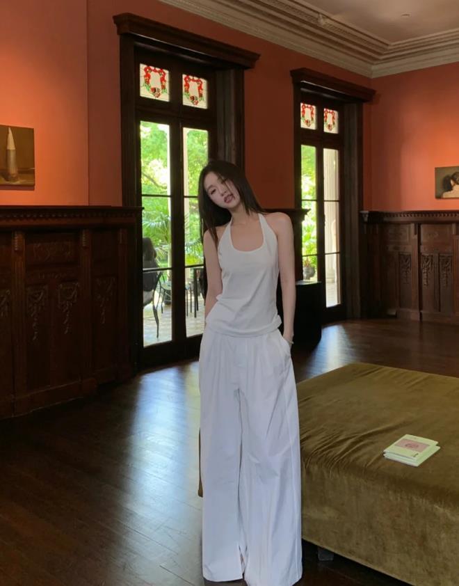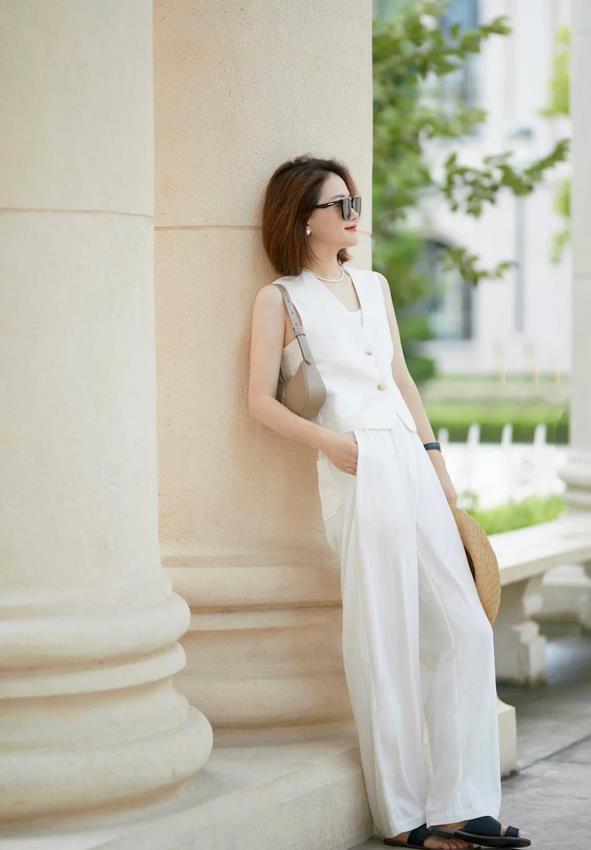 夏天,就是要選擇一身乾淨的白色,簡單幹淨又自在輕盈,怎麼看都不覺得膩,白色馬甲+白色闊腿褲,鞋子的話,可以隨便配一雙黑色涼拖鞋,舒適極了,也很好看。