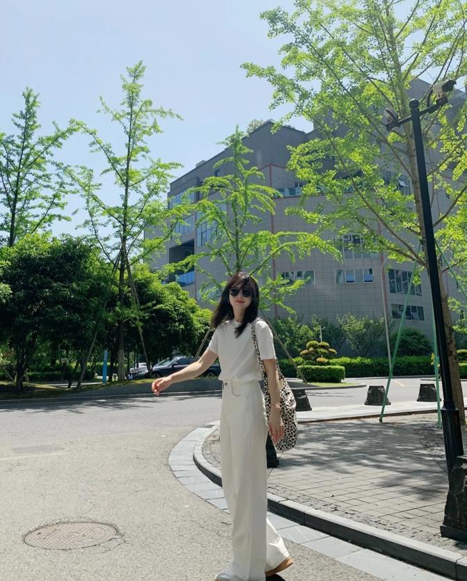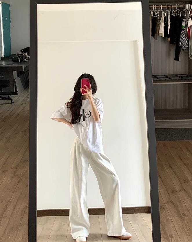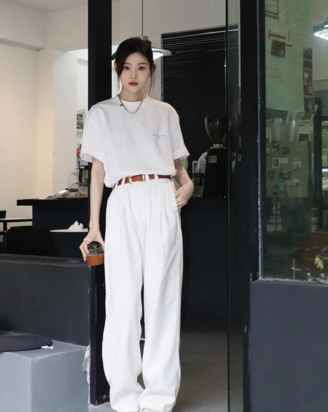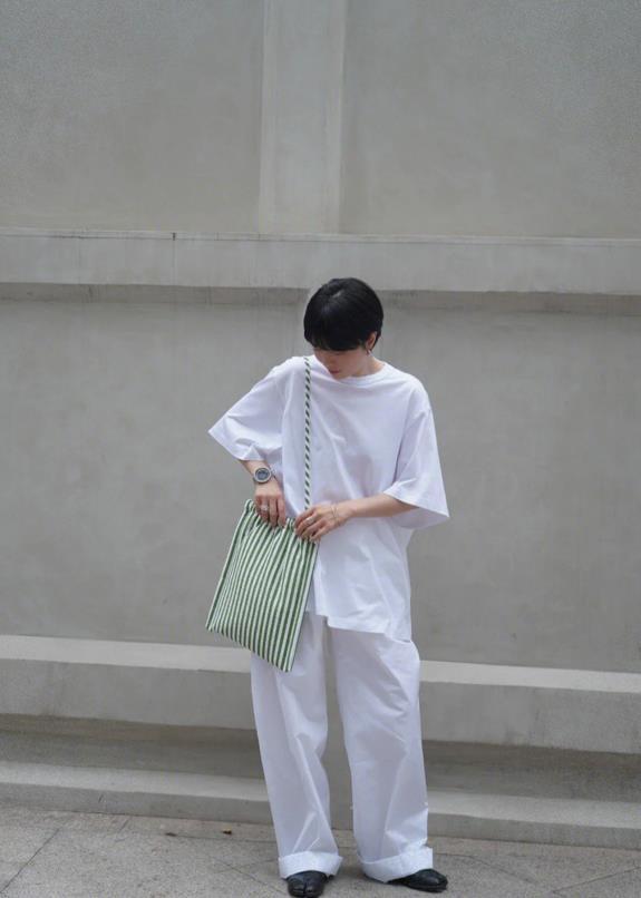 夏日的穿搭,最好可以呈現出自由隨性的狀態,白色寬鬆短袖t恤+白色闊腿褲,這兩種單品都是很簡約高級的款式,組合在一起,有種很極簡的美。乾淨的白色,百搭又耐看,最重要的是能在視覺上呈現出一種降溫效果。