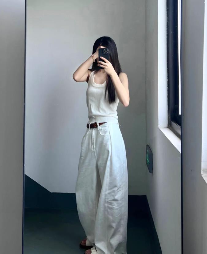 白色背心+白色牛仔闊腿褲,褲子的長度是有些拖地的,但並不礙事,稍微提高起一些腰線後,就可以很好拉長腿部線條了,配上棕色皮帶點綴一下,完美的身材比例就呈現出來了。