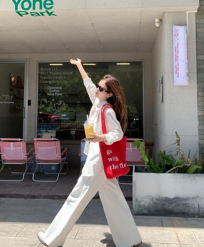 就算是天天穿也不會覺得膩的一套白色系穿搭,透氣性十足的白色闊腿褲,舒適自在又輕鬆,自帶慵懶氣息,微風一吹,真的太舒服了,紅色的鞋子和包包,都對整個穿搭起到了很好的點綴作用。