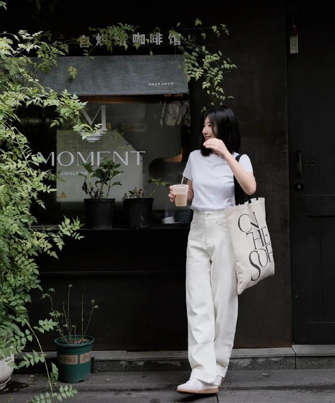 喜歡這種鬆弛感的穿搭,白色短袖t恤,版型是寬鬆的,對身材有着極佳的包容性,顯瘦效果賊佳的,搭配白色牛仔闊腿褲,寬鬆的褲型,胖瘦都可以穿,百搭且不挑身材,選擇一雙德訓鞋來配,可好看了。