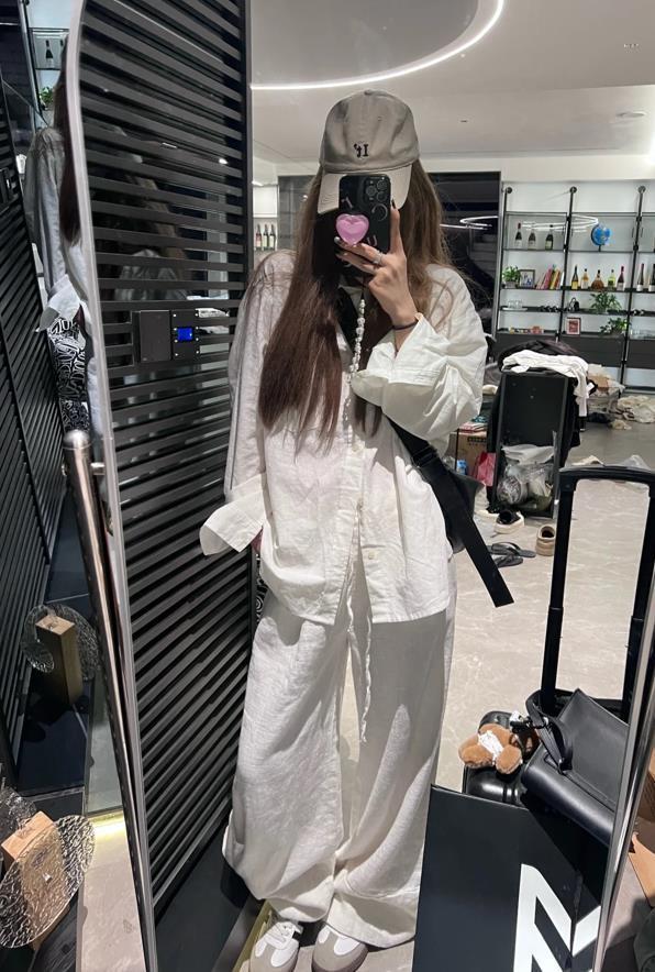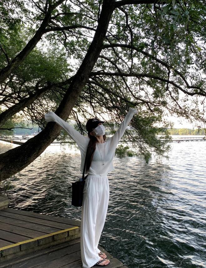 慵懶鬆弛感的套裝,隨性自在又不失簡單,白色背心+白色防曬衫+休閒闊腿褲,很乾淨的組合,輕鬆又不費力。這種寬鬆版型的褲子,對身材沒有一點約束感,穿起來可藏肉顯瘦了。