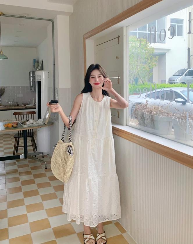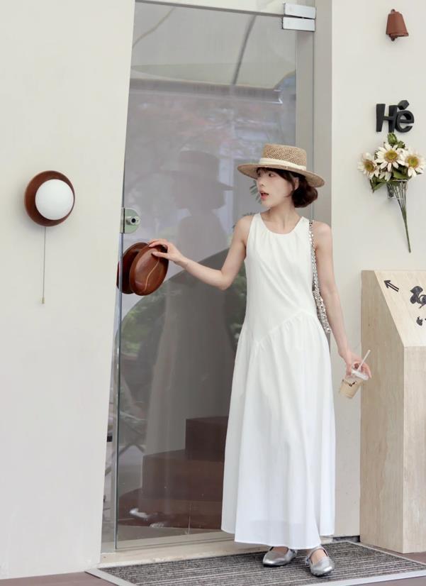 很遮肉顯瘦的小白裙,無袖款式,大夏天穿起來可太清爽涼快了,寬鬆的裙身版型,不管你是什麼身材都能輕鬆駕馭,在度假或者是逛街的時候都可以選擇它來穿,隨便配上一雙涼拖鞋就很美了。