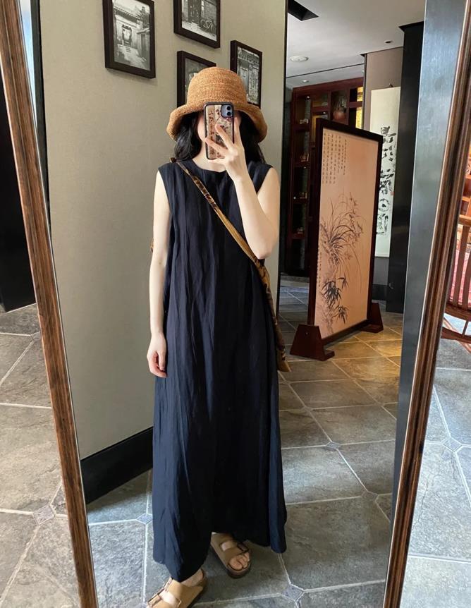 黑色的亞麻連衣裙,真的簡單大方又不失高級,說實話的,這種面料在夏天穿起來可太合適了,寬鬆的版型,帶着鬆弛和隨性。無袖的款式,更是清爽涼快極了,夏天就是喜歡這種寬鬆一點版型的裙子,走路都帶風的既視感。