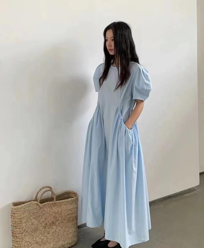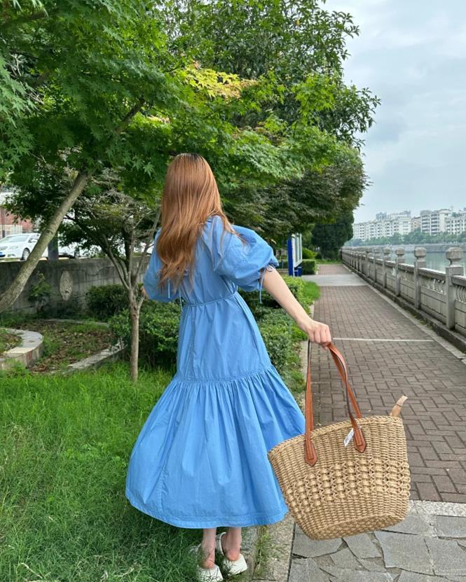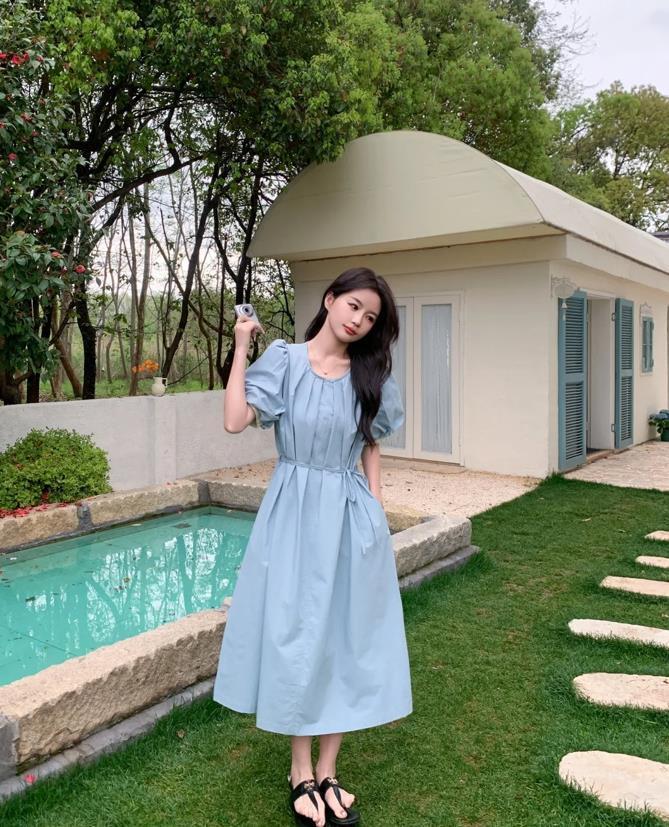 藍色系的連衣裙,真的是讓人無法拒絕啊,收腰和大裙襬的設計,賦予了你優雅和大氣,很清爽的顏色,視覺上就可以起到降溫的效果,想要顯白的,穿這個顏色真的很合適了。