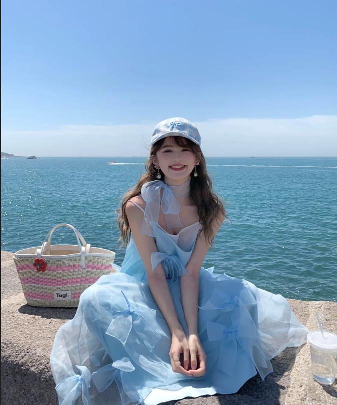 海鹽薄荷味的夏天,由內而外散發着清爽的氣息,吊帶藍色連衣裙,低飽和度的配色,黃黑皮膚色都是可以駕馭的,很襯膚色和顯白。蝴蝶結點綴,細節感滿滿,拍照可是超級上鏡的。