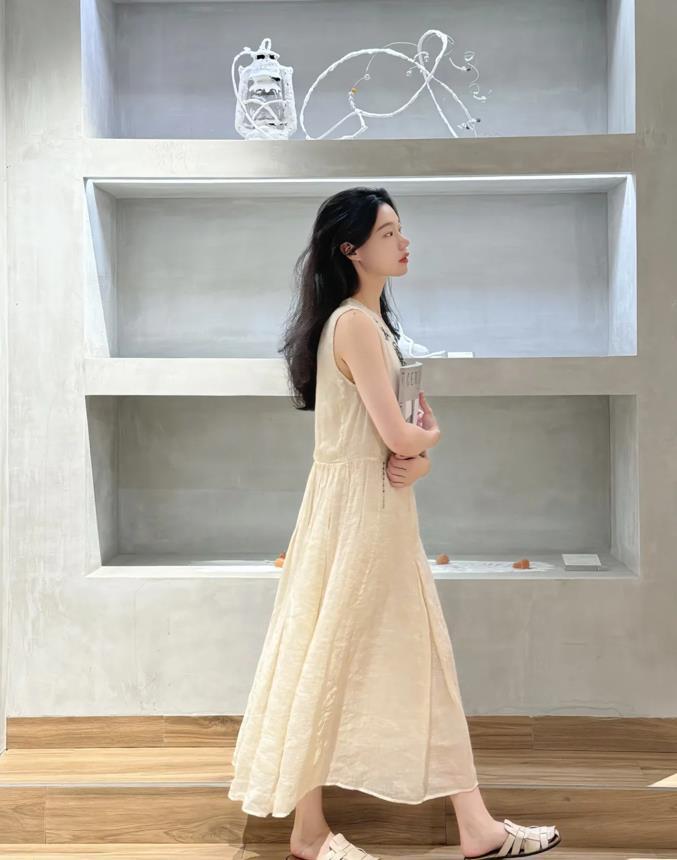 喜歡這種亞麻連衣裙帶來的純淨和舒適感,輕盈又透氣,柔軟又親膚,寬鬆的裙身版型,可是很藏肉顯瘦的,更能讓你穿出舒適感。腳下踩着一雙包頭涼拖鞋,隨性又自在。